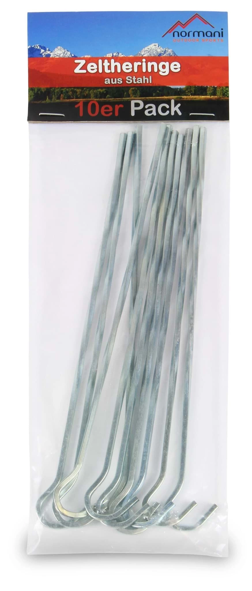 Die stabilen, 23 cm langen Zeltheringe im 10er Pack aus verzinktem Stahl gehören zu jeder Standard-Campingausrüstung. Die Erdnägel können tief in den Wald- oder Wiesenboden versenkt werden und sind mit 3 mm Durchmesser so robust, dass Ihre Zeltplane auch an windigen Tagen gut gesichert ist. Das Profil ist rechteckig und unten spiralförmig gedreht, sodass es sich gut in weichere, erdige Böden drehen lässt. Am Haken können die Heringe per Schnur oder Reservehering rasch wieder gezogen werden. Die Stahlheringe sind dank der Zinkbeschichtung korrosionsbeständig und können somit mehrmals wiederverwendet werden.
