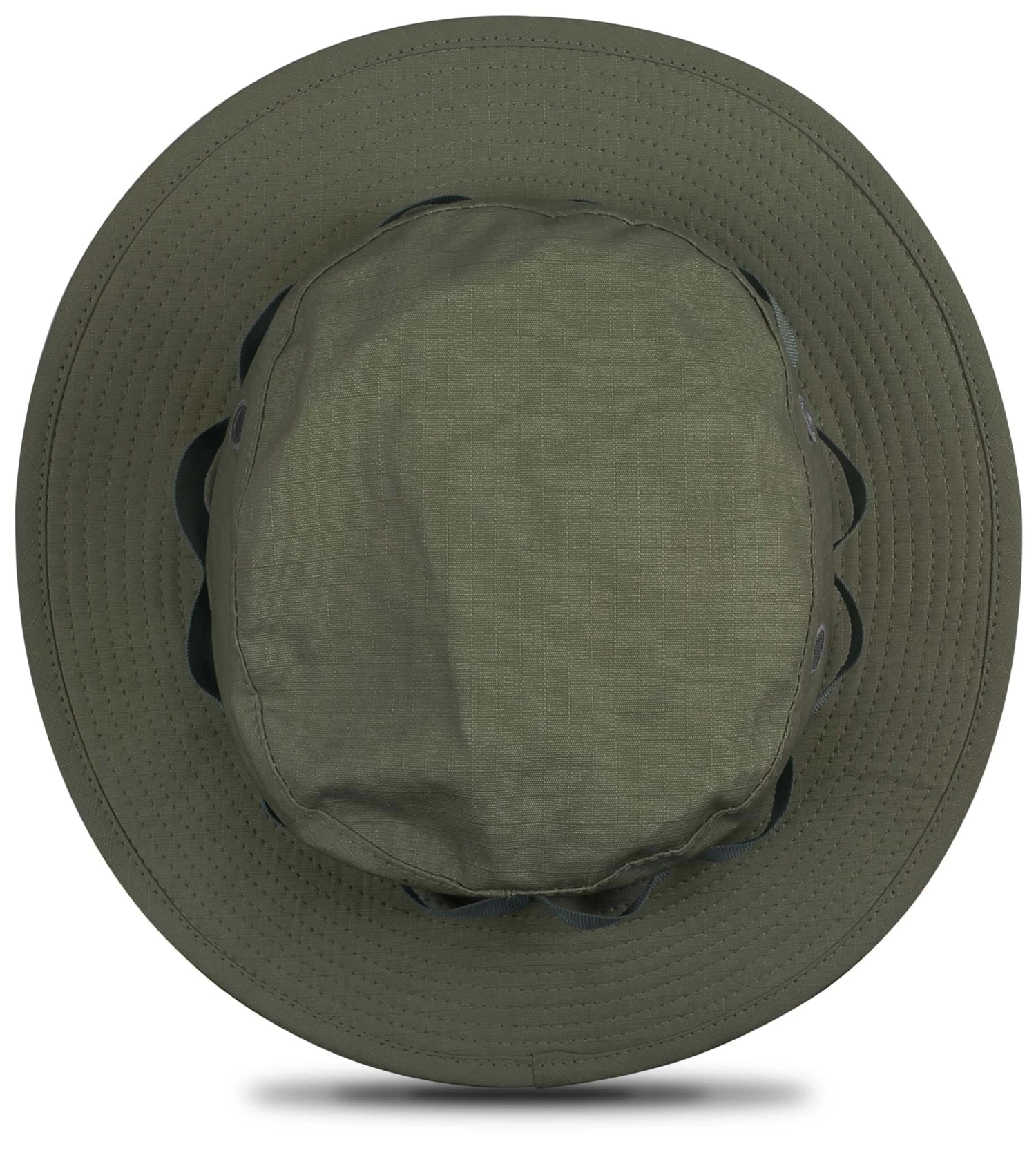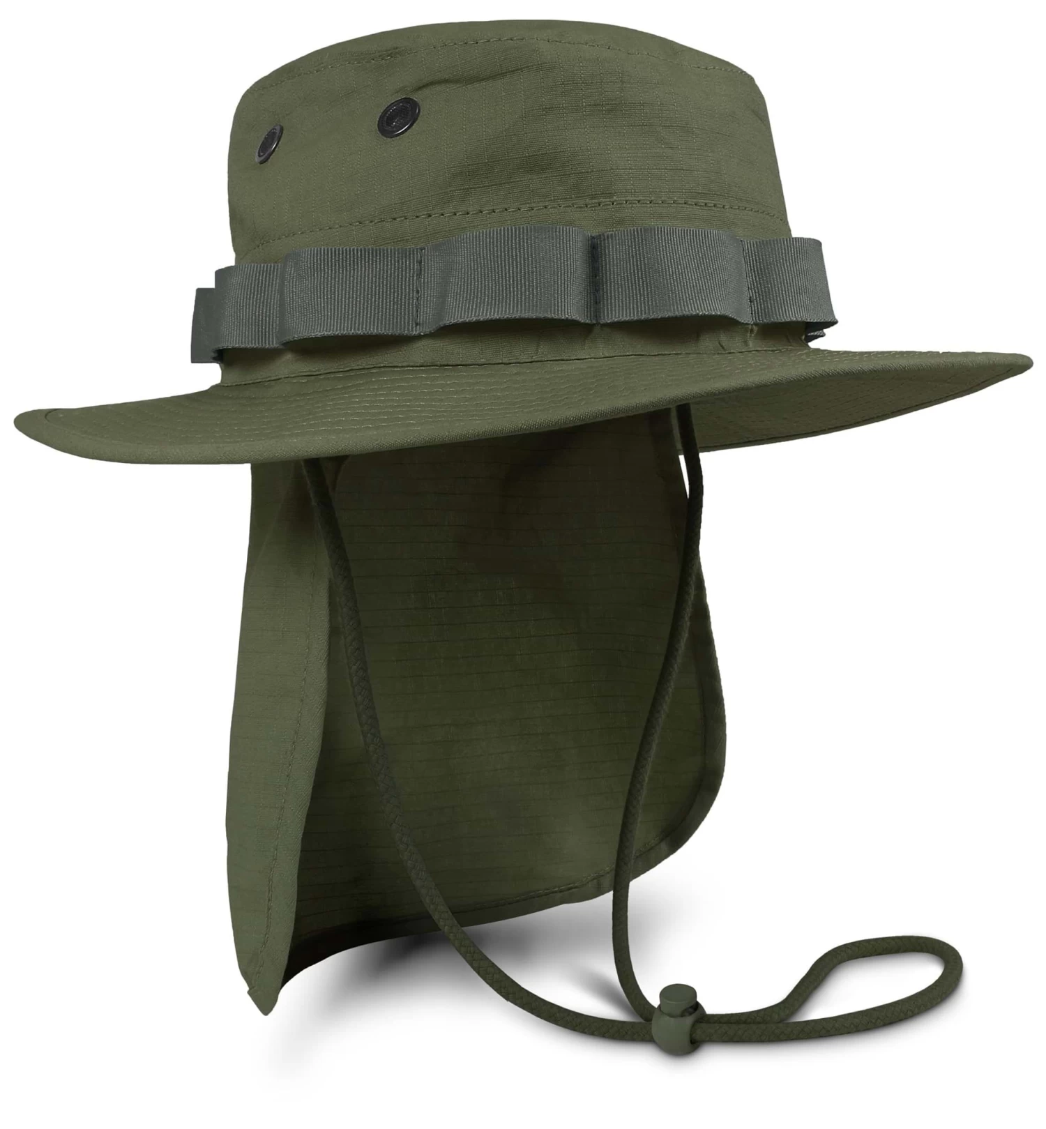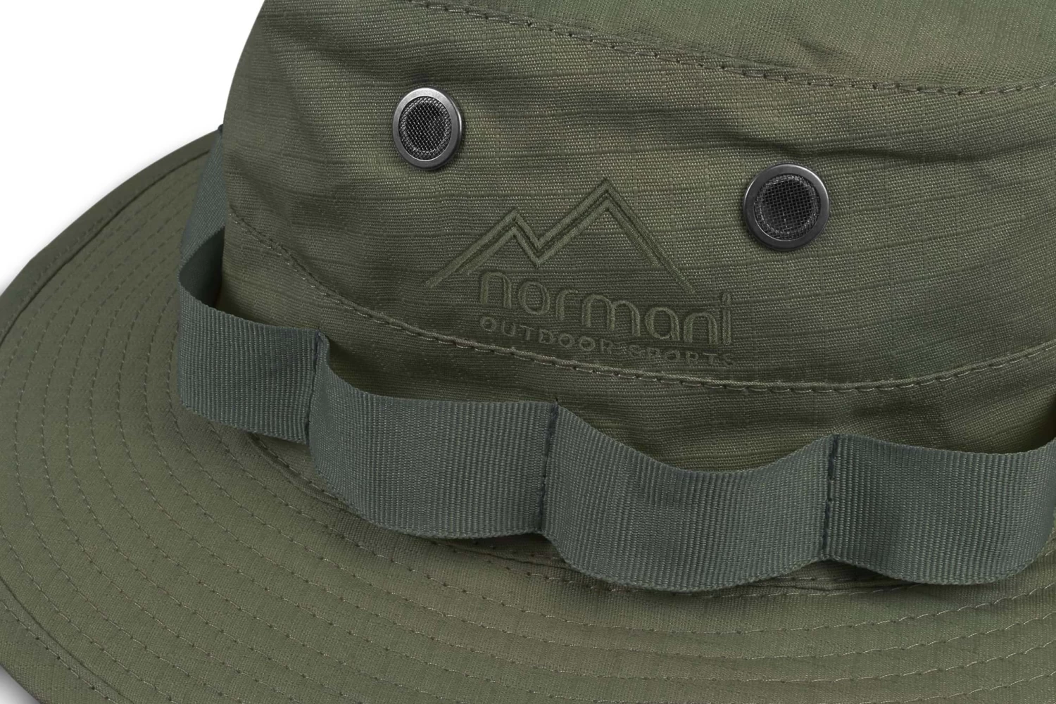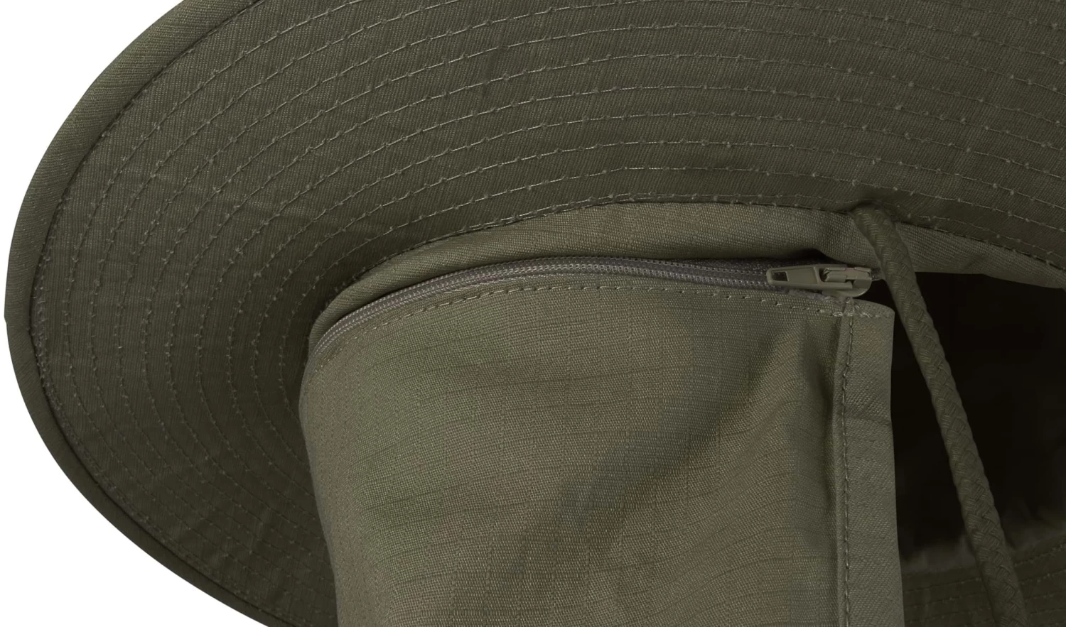 Der Boonie Hat erlangte ursprünglich als Tropenhut der US Army große Bekanntheit. Damals sowie heute wurde der tropische Krempenhut vor allem in wärmeren Regionen verwendet, zum Beispiel im Dschungel. Mit seiner breiten Krempe schützt er Kopf und Gesicht zuverlässig vor Sonnenstrahlen. In der hochwertigen Ripstop-Ausführung ist der Boonie Hat besonders reißfest, hautsympathisch und strapazierfähig. Durch eine 10-fach gesteppte Krempe wird deren Stabilität erhöht und sogar Regen wird bis zu einem gewissen Grad erfolgreich abgewiesen. Beim 2-in-1 Boonie Hat „Junglescout“ ist ein langer Nackenschutz eingezippt, der auch den Nacken erfolgreich vor einfallenden Sonnenstrahlen schützt. Dieser kann jederzeit abgenommen und separat in der Hosentasche verstaut werden. An beiden Seiten des Hutes befinden sich, horizontal angeordnet, je zwei eingefügte Fliegengitterösen zur wohltuenden Ventilation des Trägerhauptes und zur Abwehr von Insekten. Am Hut-Umbind sind 12 MOLLE-Schlaufen befestigt, die zunächst nur als Accessoire in Verwendung treten, aber durchaus auch als Befestigungsmöglichkeit für etwaiges Tarnmaterial oder andere leichte Gegenstände dienen können. Selbst der Fahrtwind im offenen Geländewagen vermag den Buschhut nicht vom Kopf zu wehen, sobald der Kordelstopper des Kinnbandes enger ans Kinn gezogen wurde. Wird der Hut nicht mehr gebraucht, ist es ein Leichtes ihn zusammengefaltet in der Tasche zu verstauen.