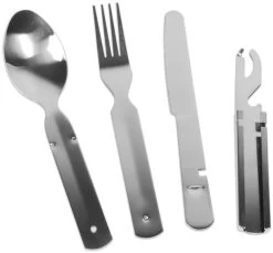Das 4-teilige BW-Essbesteck aus rostfreiem Edelstahl kommt als kompaktes, ineinandergestecktes Set. Auf diese Weise ist das stabile, 200 g leichte Feldbesteck mit Dosen-/Flaschenöffner gut in der seitlichen Rucksackaußentasche transportierbar.