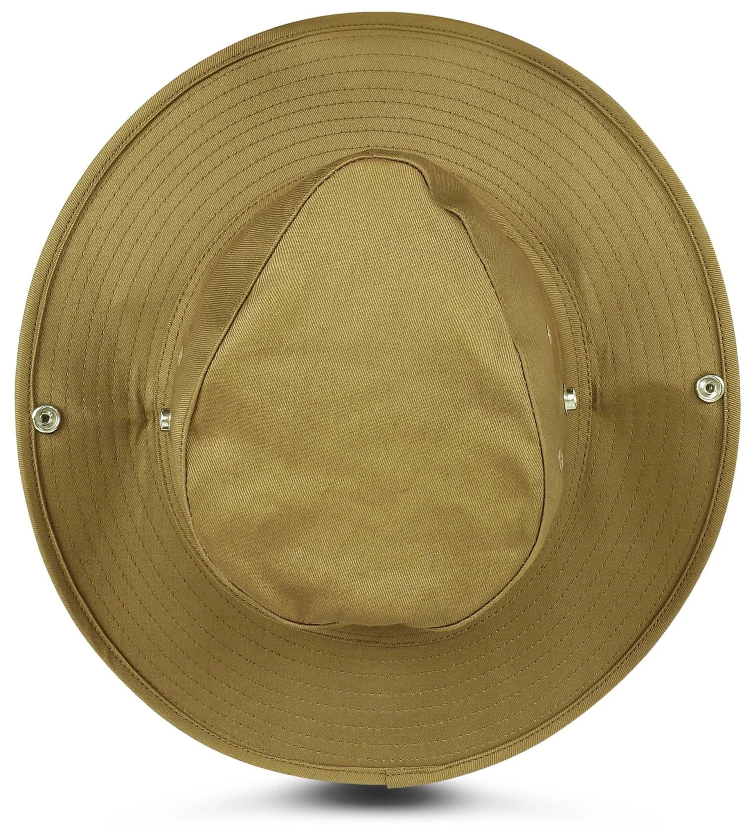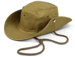 Der klassische Australian Buschhut mit seiner breiten Krempe schützt Kopf und Gesicht zuverlässig vor Sonnenstrahlen. Während der Safaritour im offenen Geländewagen kann ein Wegwehen bei starkem Fahrtwind verhindert werden, indem der Kordelzug enger an den Kopf gezogen wird.
