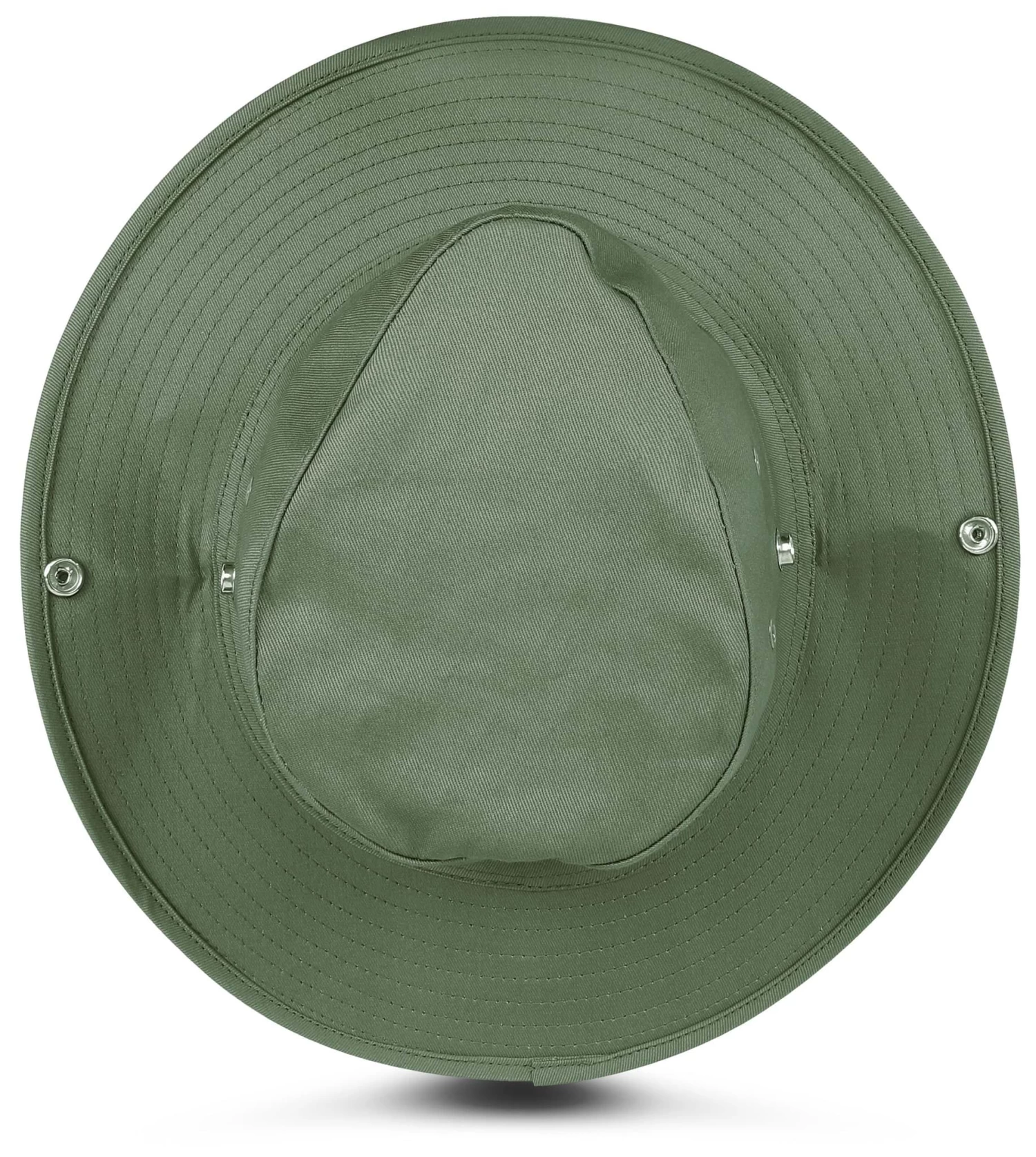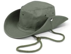 Der klassische Australian Buschhut mit seiner breiten Krempe schützt Kopf und Gesicht zuverlässig vor Sonnenstrahlen. Während der Safaritour im offenen Geländewagen kann ein Wegwehen bei starkem Fahrtwind verhindert werden, indem der Kordelzug enger an den Kopf gezogen wird.