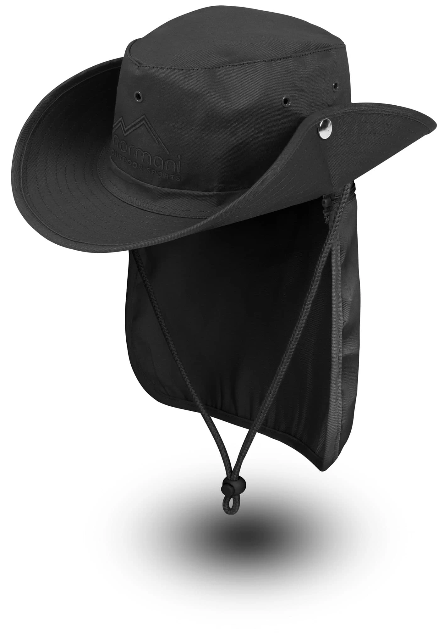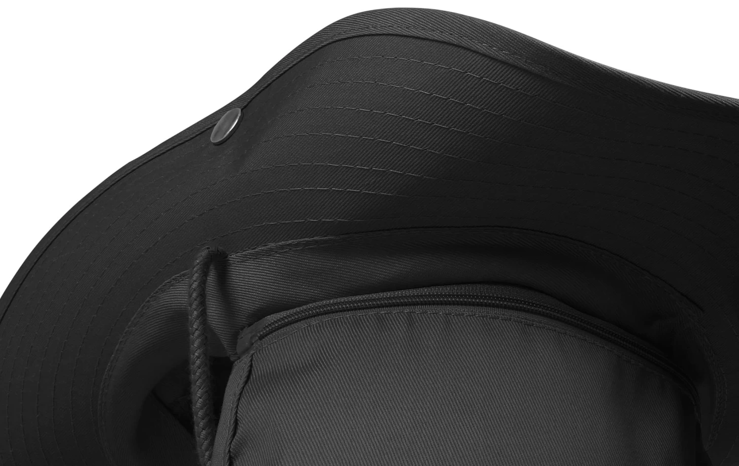 Der Buschhut „Australian Outback“ mit abnehmbarem Nackenschutz spielt seine Vorzüge besonders in Regionen mit langer und intensiver Sonneneinstrahlung aus. Die gezielt breit geschnittene Krempe und der extra lange Nackenschutz schützen Kopf, Gesicht und Nacken zuverlässig vor Sonne. Der Nackenschutz lässt sich durch einen Reißverschluss einfach vom Hut trennen, sodass der Träger einen schlichten Buschhut „Australian“ erhält. Abgetrennt lässt er sich zusammenfalten und z.B. in der Hosentasche verstauen. Die Krempe kann bei Bedarf durch beidseitige Druckknöpfe aufgerichtet werden. 5 seitliche Belüftungslöcher sowie das atmungsaktive Mischgewebe sorgen für angenehme Luftzirkulation, wirken klimaregulierend und erhöhen somit den Tragekomfort. Bei starkem Wind kann der „Australian Outback“ mit Hilfe des verstellbaren Kinnbandes mit Kordelzug enger an den Kopf gezogen werden, somit wird das Wegwehen des Hutes verhindert.