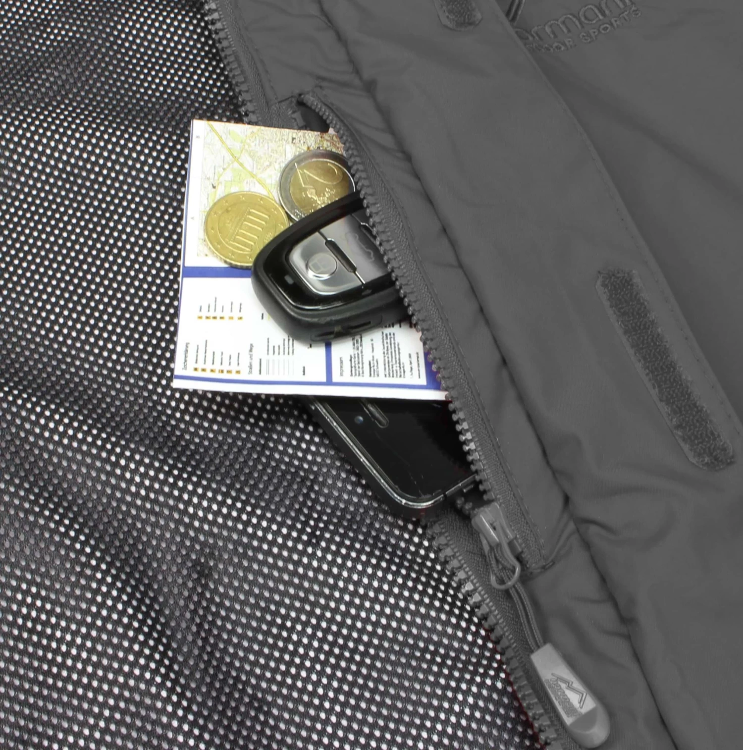 Maximale Bewegungsfreiheit gepaart mit wasser- und winddichten Materialien. Die Hardshellweste bietet zahlreiche Funktionen, um in diversen Einsatzbereichen, wie beim Joggen, Reiten, Wandern, Walking oder im Alltag zu bestehen. Das ZIP-T3K System ermöglicht unterwegs die Wärmezufuhr individuell zu erhöhen, indem einfach und flexibel eine weitere Weste oder Jacke, aus wärmendem Fleece eingezippt werden kann. Schnürzug im Saum, zum Schutz der Nieren vor eindringender kalter Luft, Ärmelbündchen mit Klettverschluss und einer Kapuze mit Volumenregulierung hinten und vorne. Das Netzfutter innen, wirkt wärmeregulierend und sorgt, wenn die Jacke geschlossen ist, für eine ausreichende, angenehme Luftzirkulation. Unter der Patte auf Brusthöhe, befindet sich eine Reißverschlusstasche. Diese eignet sich sehr gut für ein sicheres Aufbewahren von Portemonnaie, Telefon oder Autoschlüssel. Die wetterfeste Outdoorweste wird mit einem Reißverschluss, mehreren Klettstreifen und 2 zusätzlichen Druckknöpfen geschlossen. Somit ist auch bei stärkerem Wind der Oberkörper gut geschützt. Der rundum hochstehende Kragen, und die verstellbare Kapuze, schützen zusätzlich Hals und Kopf.