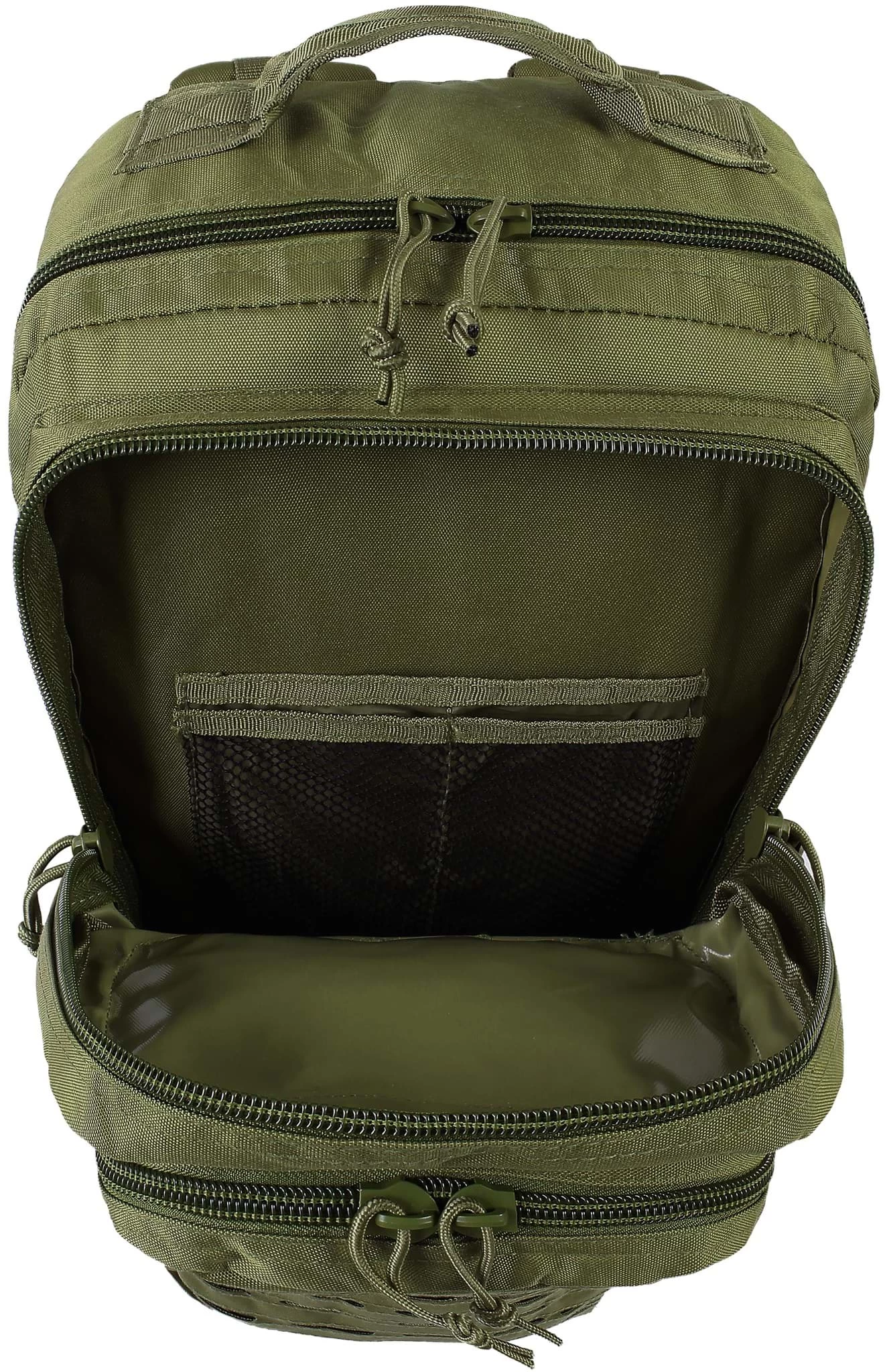 Der Rucksack „Laser Tec“ stellt die 2. Generation des klassischen Assault Packs dar und besticht, genau wie sein Vorgänger, durch die ergonomisch gepolsterten Schultergurte mit Aufnahmepunkten sowie dem durchgängig gepolsterten Rücken. Die Schultergurte sind ca. 5 cm breit und längenverstellbar. Der ebenfalls in der Länge verstellbare Bauchgurt mit Schnellverschluss und Hüftstabilisierung sorgt für eine gleichmäßige Lastenverteilung und beugt schmerzenden Schultern oder einem verspannten Nacken vor. Zahlreiche Ösen sowie diverse MOLLE-Aufnahmepunkte dienen dem zusätzlichen Anbringen von Ausrüstungsgegenständen. Die spezielle, lasergeschnittene Oberfläche mit „Laser Tec-Aufnahmesystem“ umfasst insgesamt 108 Aufnahmepunkte und ermöglicht eine noch schnellere und einfachere Anbringung weiterer Gegenstände außerhalb des Rucksacks. Das Hauptfach verfügt über ein Reißverschluss-Innenfach, das Platz für wichtige Utensilien, wie Portemonnaie, Autoschlüssel oder Handy, bietet. Das Netzfach eignet sich optimal für ein Tablet oder andere empfindliche Elektrogeräte. Das mittlere Fach hat ebenfalls eine Innenaufteilung mit 3 Einschubtaschen. Ein Organizer in der unteren Fronttasche bringt beispielsweise einen Stadtplan mit 4 Stiften unter. Der Rucksack verfügt weiterhin über eine Volumenkontrolle und eine Gepäckfixierung mit seitlichen und am Rucksackboden befindlichen Kompressionsriemen. Ein integriertes Klettfach für ein Hydropack befindet sich an der Rückseite. Der Rucksack mit Tragegriff besteht aus robustem Polyester, das für eine hohe Lebensdauer sorgt. Sie können ihn für Ausflüge und Wanderungen, aber auch für Schule oder Arbeit verwenden.