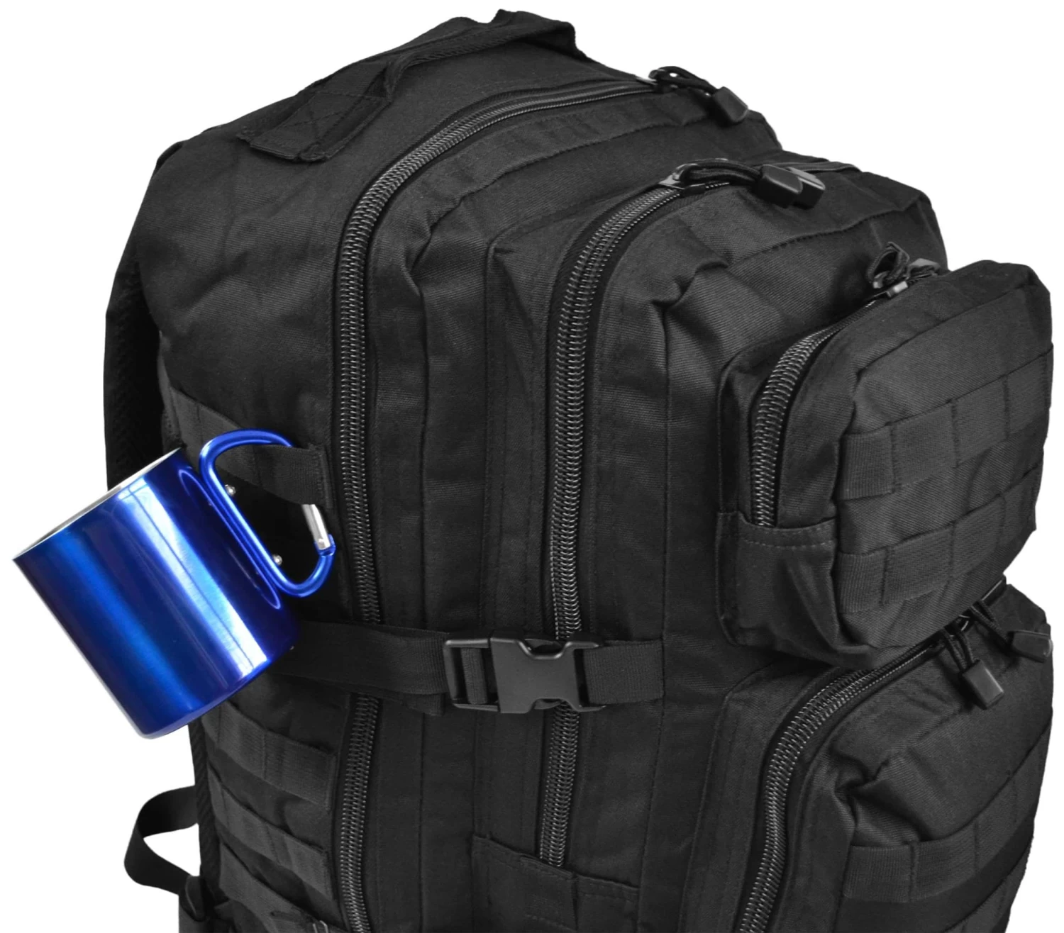 Diese doppelwandige Camping-Tasse mit Karabinerhaken als Henkel ist aus rostfreiem Edelstahl gefertigt, leicht und robust. Am Karabiner kann die bruchfeste Tasse außen am Rucksack an einer MOLLE-Schlaufe angehängt werden und ist so immer schnell zur Hand.