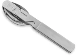 Das vierteilige „OFW“ Bund Essbesteck aus rostfreiem Edelstahl besteht aus Löffel, Messer, Gabel und Dosen- bzw. Flaschenöffner und kann kompakt ineinandergesteckt werden. Einmal eingerastet, lässt sich das 200 g leichte Besteck beispielsweise in einer seitlichen Rucksackaußentasche sicher transportieren. Das Messer ist nachschärfbar und die Gabelzinken laufen spitz zu.