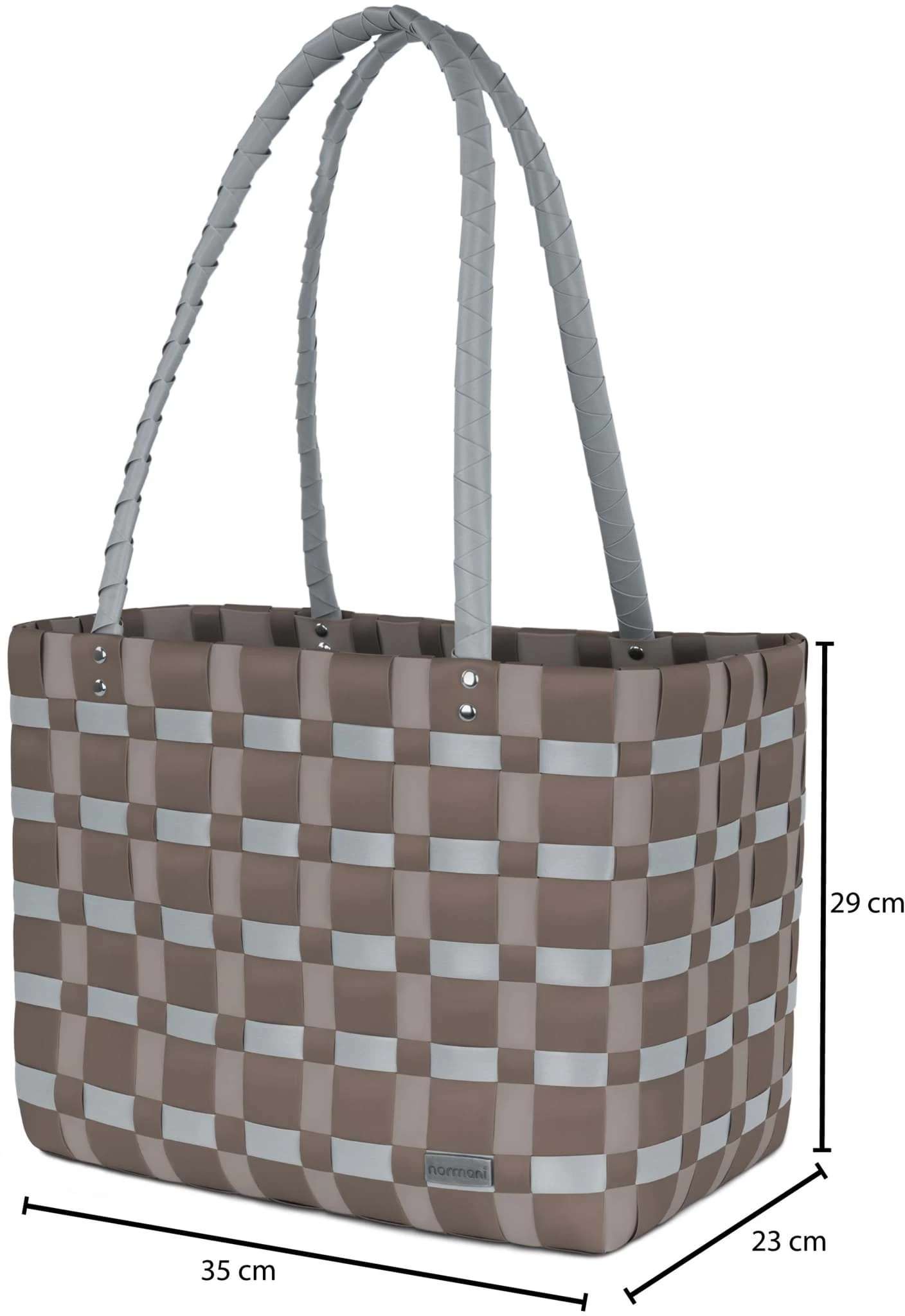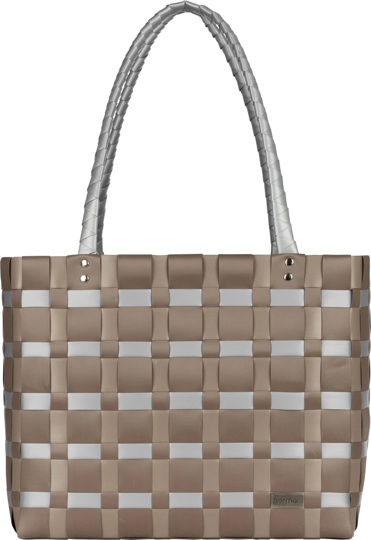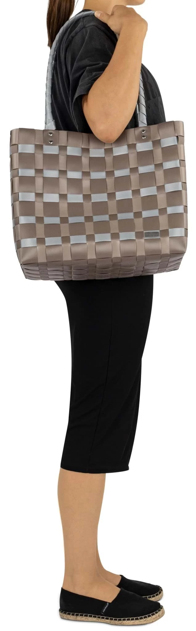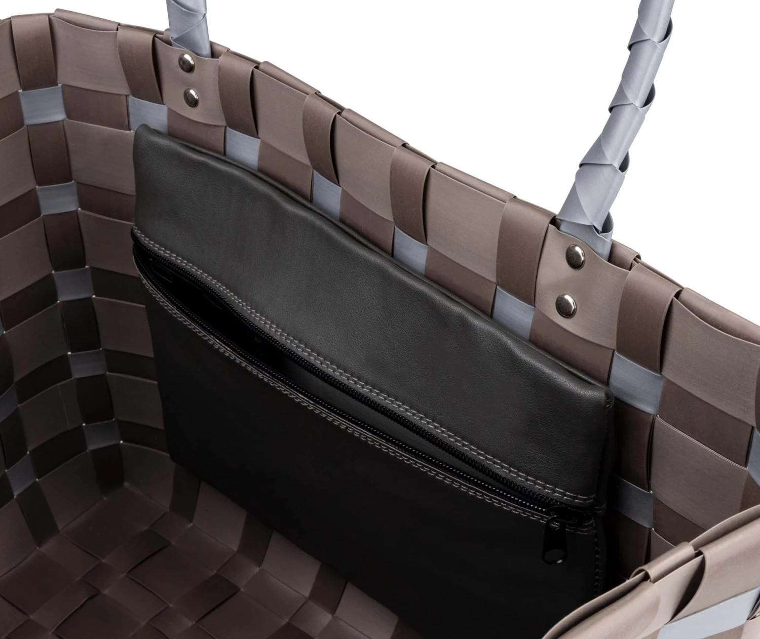 Die oben angenieteten Griffe sind ebenfalls geflochten und liegen angenehm in der Hand. Sie halten ein hohes Gewicht aus wie z.B. ein voller Korb mit Lebensmittel.