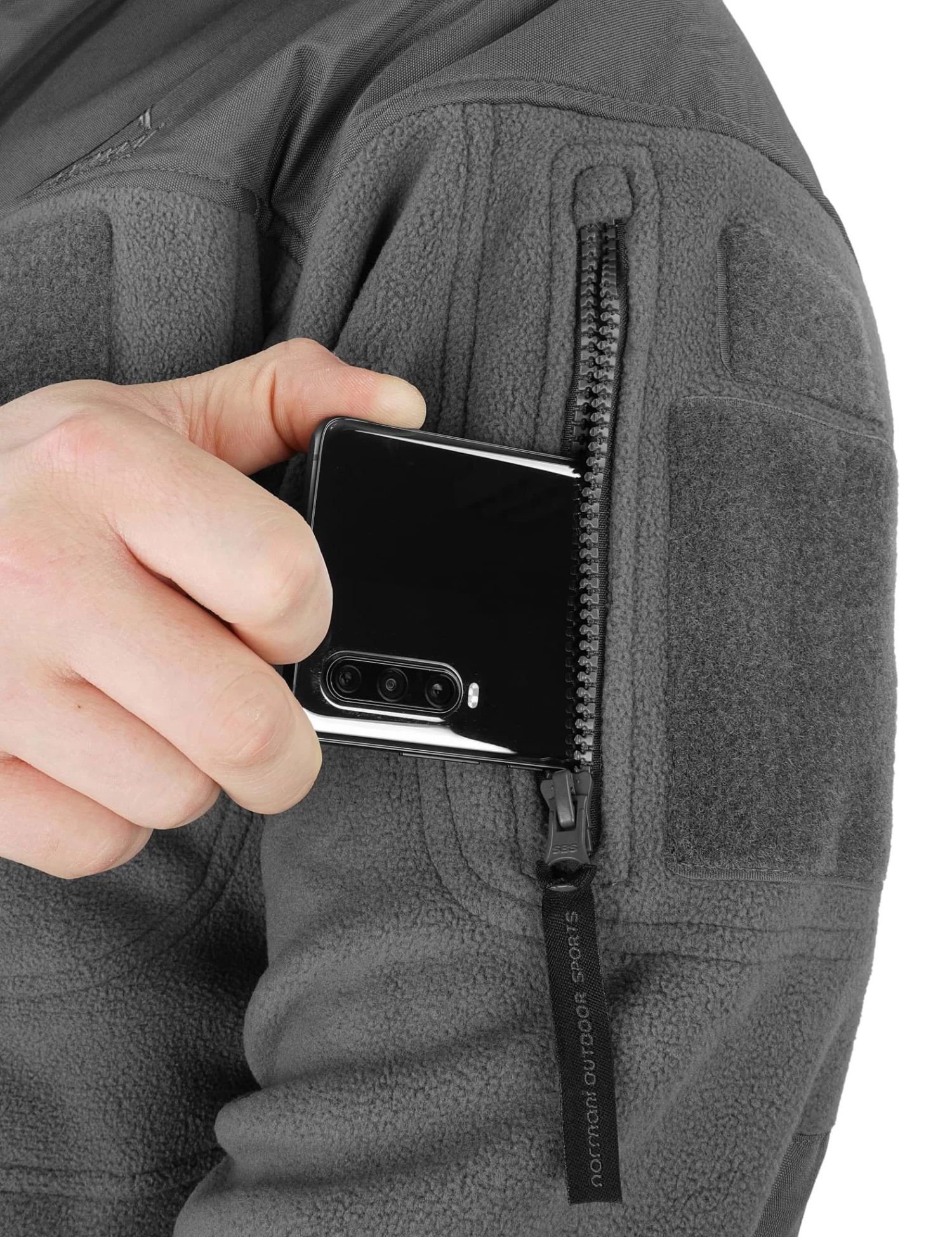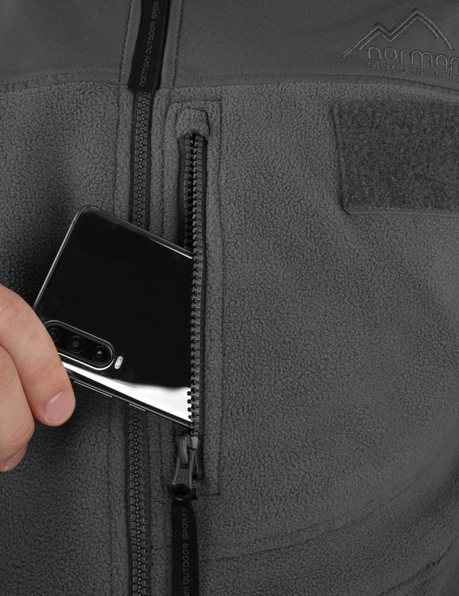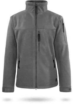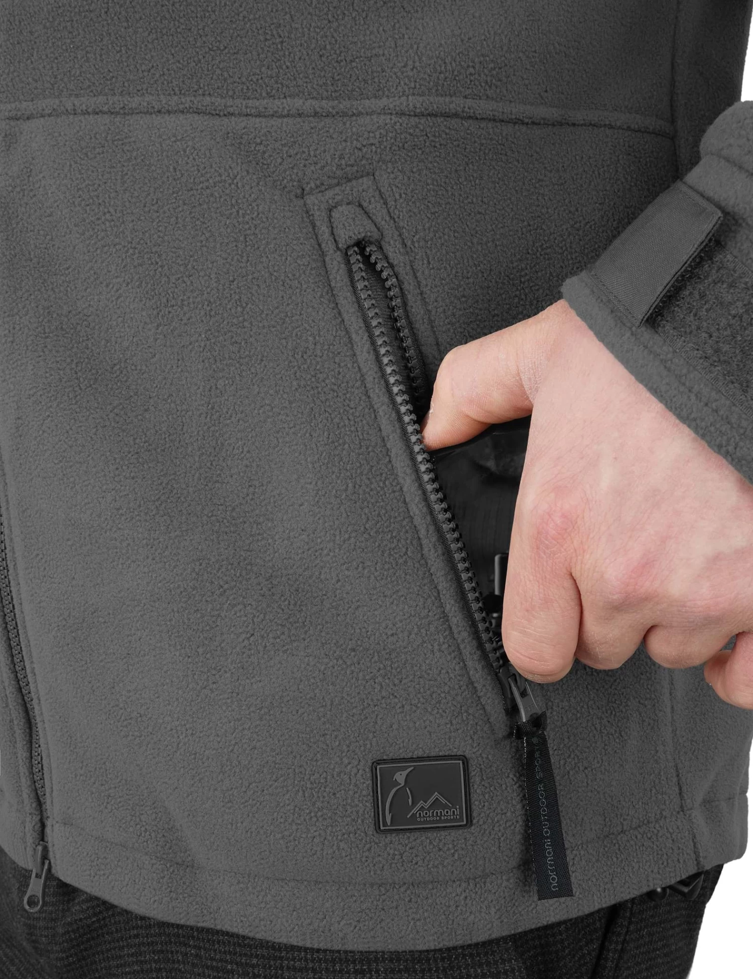 Die „Roald“ Fleecejacke in taktisch geprägter Ausführung überzeugt in vielerlei Facetten. In erster Linie sorgt das Fleecematerial mit der hohen Grammatur von 320 g/m² für ausreichende Wärmezufuhr. Daher wird an kalten Tagen nahe des Gefrierpunkts keine weitere Jacke benötigt. Zudem ist das Material winddicht und wasserabweisend. Belastungsintensive Verschleißstellen, wie Schulterbereich, Ellenbogen und Unterarm sind zusätzlich gegen Abrieb verstärkt. Ein schwerer Wanderrucksack kann problemlos auf dem Material geschultert werden. Windschutzleiste, Klettverschluss am Arm und Kordelstopper in Bund und Kragen runden den angenehmen Tragekomfort und individuelle Passgenauigkeit ab. Der Stehkragen schützt Nacken und Hals vor eisiger Kälte oder Fahrtwind. Durch die effektive Speicherung der Körperwärme, ist das Feuchtigkeitsmanagement sehr wichtig. Überflüssige Wärme oder entstandene Nässe durch Schweiß werden nach Außen weitergeleitet. Zudem trocknet das Material zügig. Unterseitige Seitentaschen, eine Brusttasche, Innentasche und obere Ärmeltasche bieten genügend Stauraum für sämtliches Equipment. Nahe am Körper ist es für den Einsatz schnell zugänglich. Alle SBS-Reißverschlüsse besitzen Zippergaragen. Der durchgezogene Frontreißverschluss kann bis zum Kinnschutz geschlossen werden. Dank des verwendeten 2-Wege-Reißverschlusses kann der untere, geschützte Teil geöffnet werden um ausreichend Luftzirkulation zu bieten, während der Hals durch den geschlossenen Kragen geschützt ist. Zusätzlich ist der Reißverschluss mit einer winddichten Leiste abgedeckt. Durch den Kordelstopper im Bundabschluss, lässt sich die Jacke sportlich eng oder locker weit im Umfang verstellen. Somit kann die Jacke der benötigten Bewegungsfreiheit optimal angepasst werden.