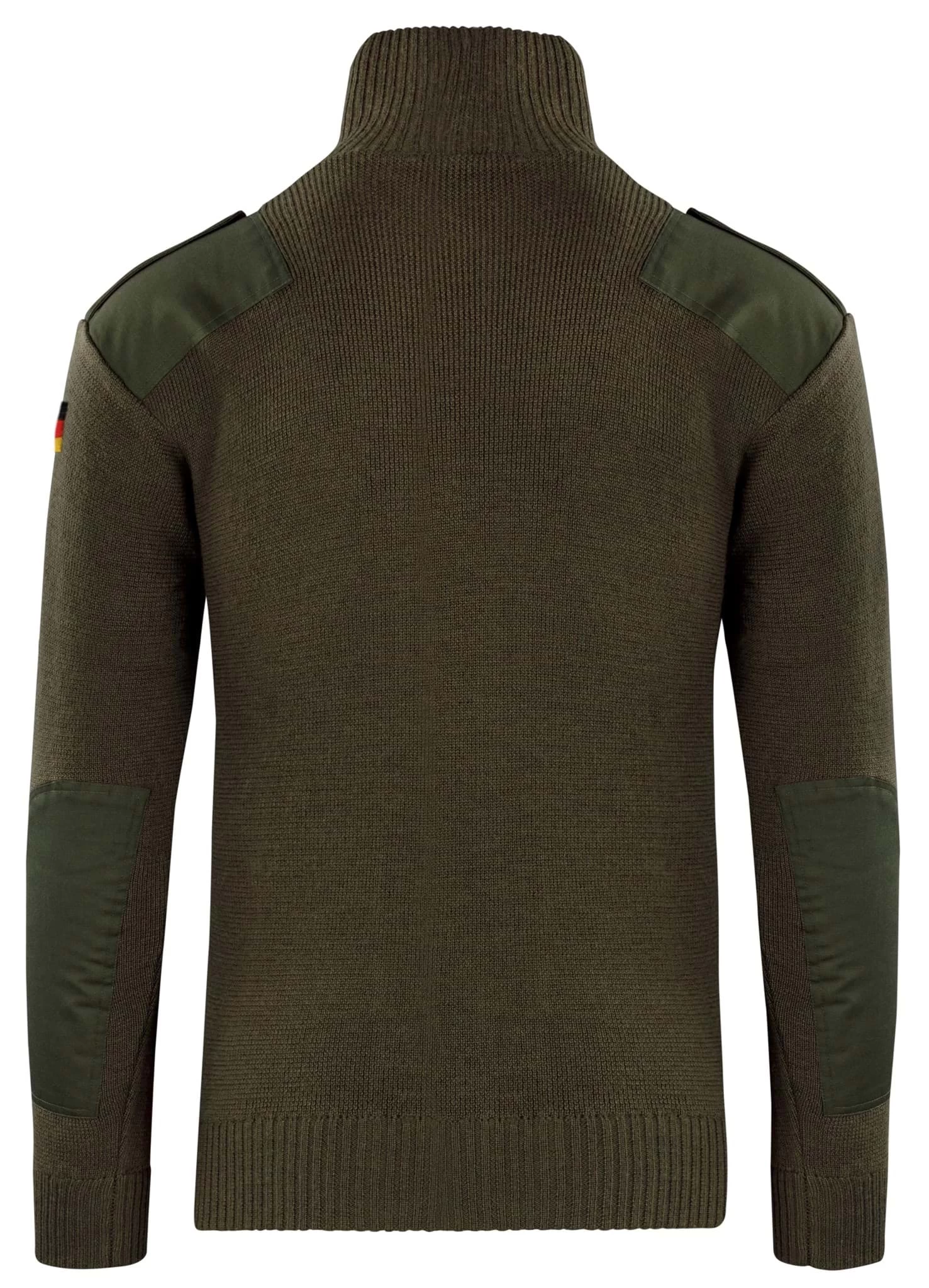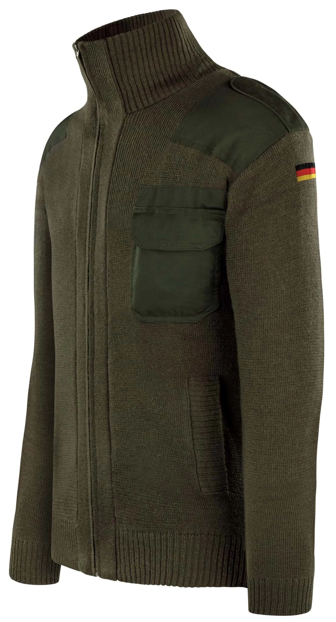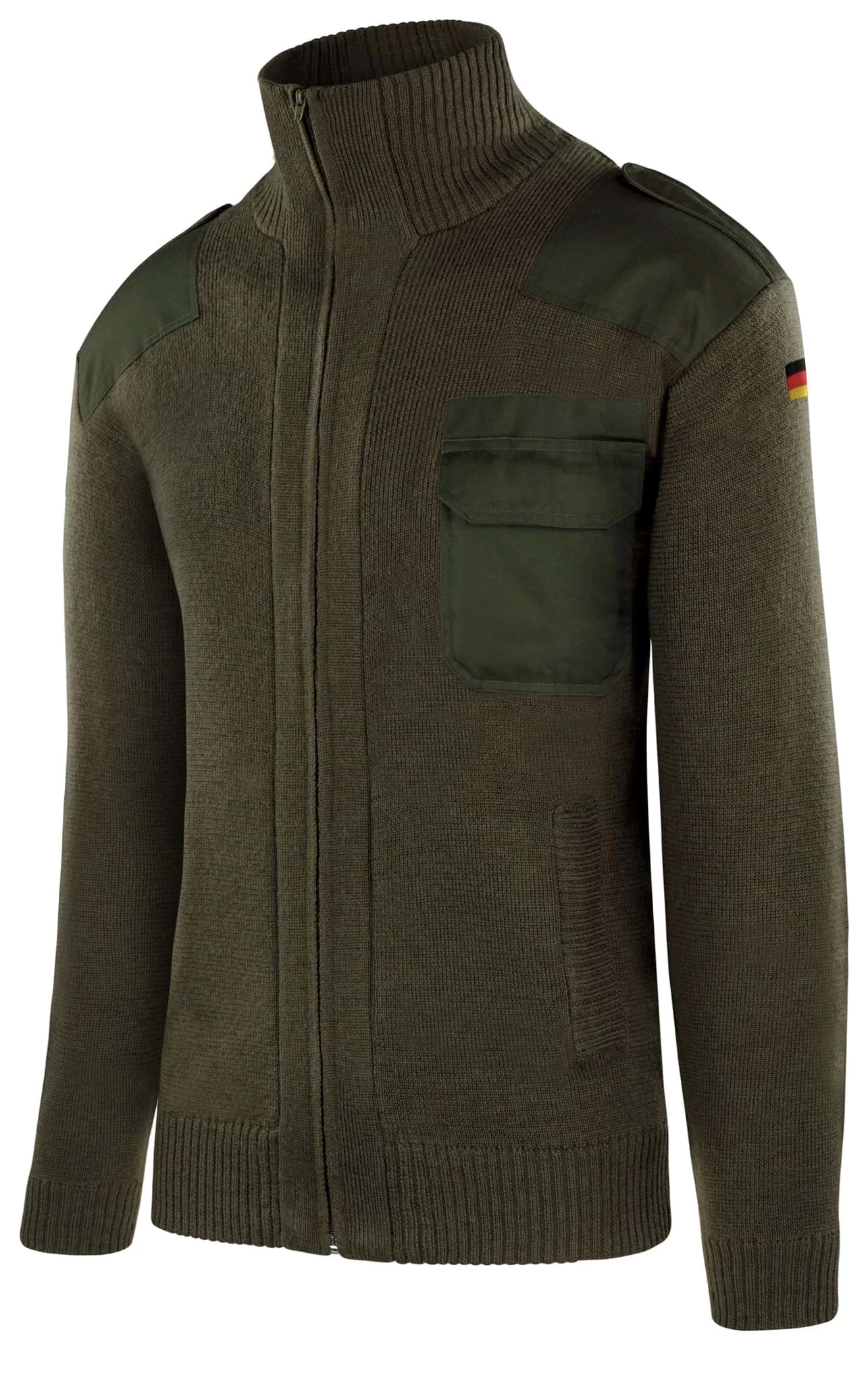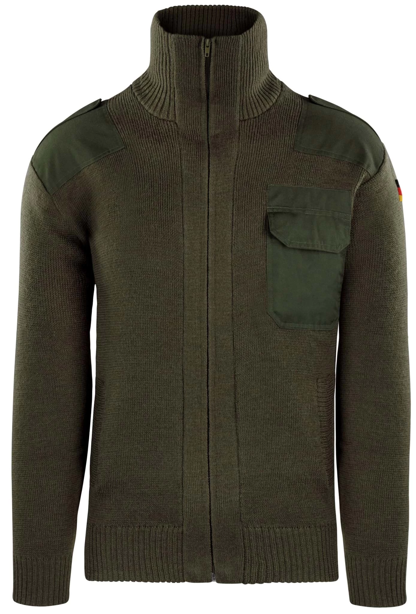 Die klassische Bundeswehr Strickjacke bietet die ideale Alternative zum klassischen Bundeswehr Pullover. Sie ist mollig warm, robust und sorgt dank der hochwertigen Materialkombination mit hohem Schurwollanteil für ein angenehmes Trageklima. Die Wolle wärmt und isoliert bei Kälte, nimmt bei Wärme die Feuchtigkeit auf und hält die Haut trocken. Die Jacke hat verstärkte Ellbogen- und Schulterpartien, besitzt einen Schulterbesatz mit Laschen und eine Brusttasche. Der hochschließende, gedoppelter Strickkragen zum Umschlagen und der abgedeckte Reißverschluss verhindern das Eindringen kalter Luft. Die Strickjacke verfügt insgesamt über drei Taschen.