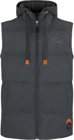 Wenn der Oberkörper etwas zusätzliche Wärme benötigt. Die vielseitige „Talmine“ Weste sorgt mit ihrer großzügigen Wattierung für Wärme und Komfort im Berg- und Naturerlebnis oder für den urbanen Kurzausflug im Großstadtdschungel. In den kälteren Monaten schützt die dicke Wattierung und das recycelte, winddichte Obermaterial hält doppelt warm. Die effiziente, silikonbeschichtete Kunstfaserfüllung erreicht einen hohen Isolationswert, dank der starken Bauschkraft, die die Luft erfolgreich einschließt. Vorteil der Polyesterfüllung ist die Resistenz gegenüber Feuchtigkeit, es trocknet schnell und wärmt auch im feuchten Zustand den gesamten Rumpf. In die zwei seitlichen Eingriffstaschen mit SAB-Reißverschlüssen können Sie Handy oder Portemonnaie sicher transportieren. Autoschlüssel lassen sich in der Innentasche sicher aufbewahren. Die Kapuze mit Kordelzug aus Sweatmaterial lässt sich per Reißverschluss und Druckknöpfen abnehmen. Der Stehkragen hält eisigen Wind von Hals und Nacken fern. Das Logopatch am Abschlussbund verleiht der Weste ihren dynamischen Look. Der Schnitt ist Regular-Fit und bietet frei bewegliche Arme, was bei sportlichen Aktivitäten wie Wandern oder Downhill von Vorteil ist.
