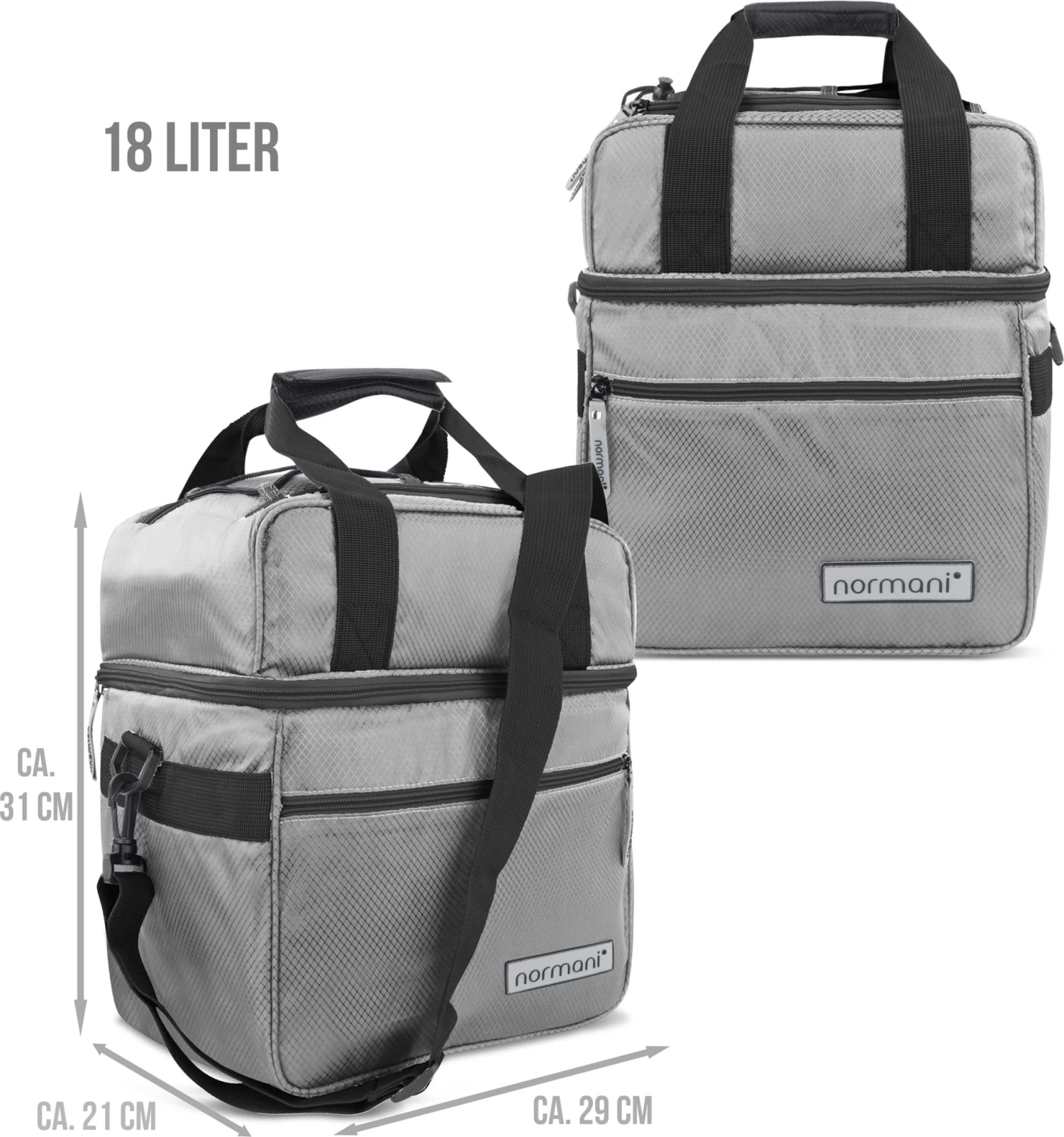 Die 18 Liter Kühltasche bietet genug Platz für Essen und Getränke für ein Picknick . Das extra Fach oben bietet sich für Obst, oder Snacks die man schnell erreichen will, an.
