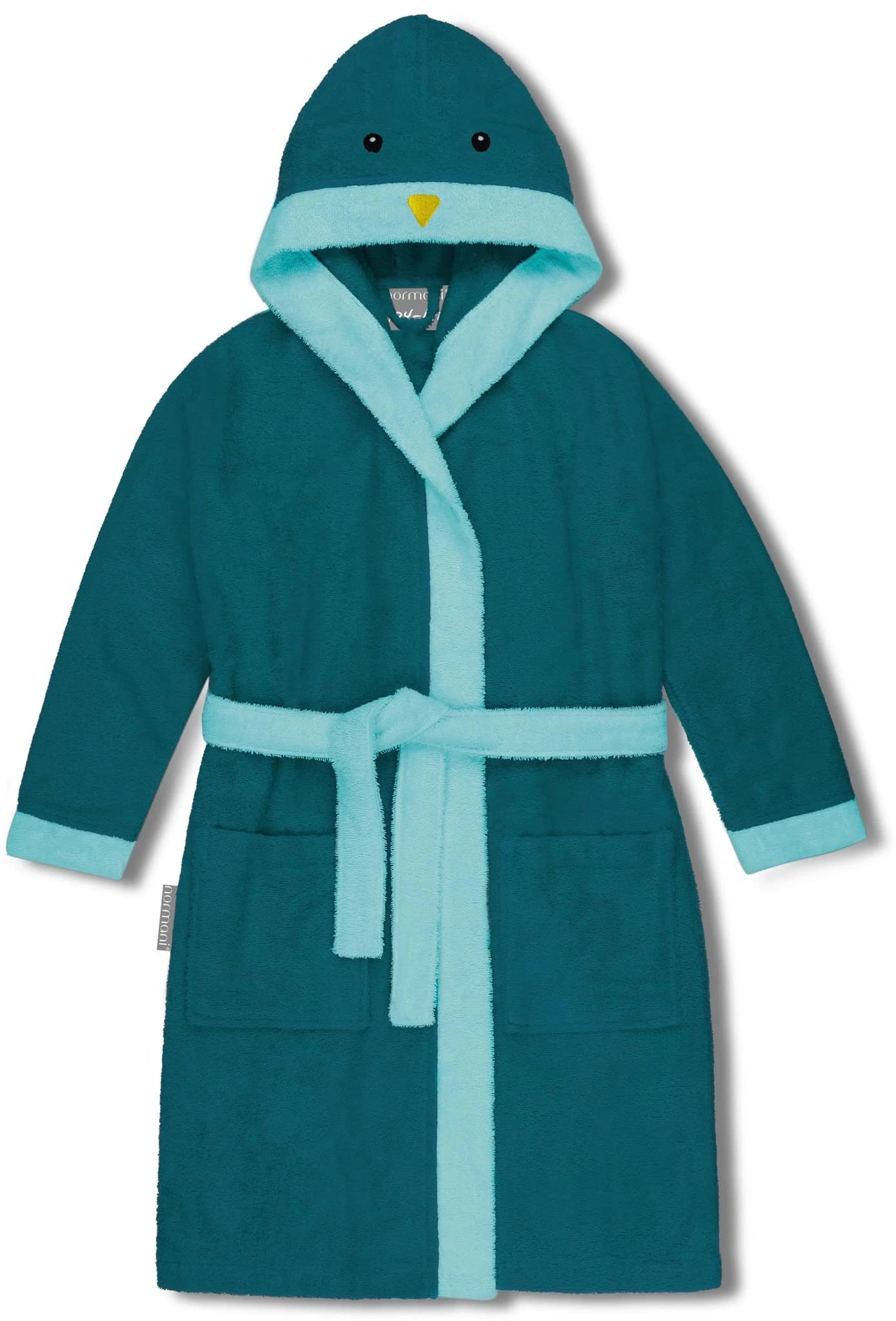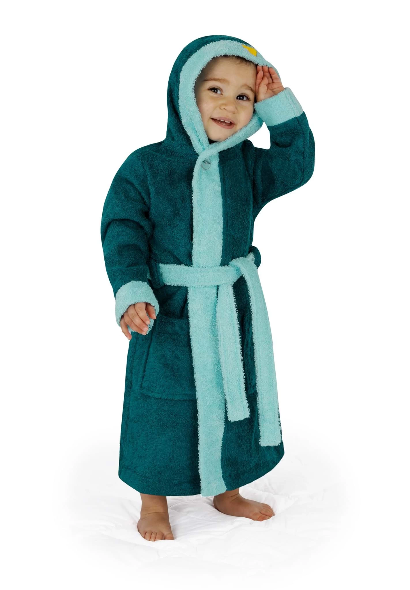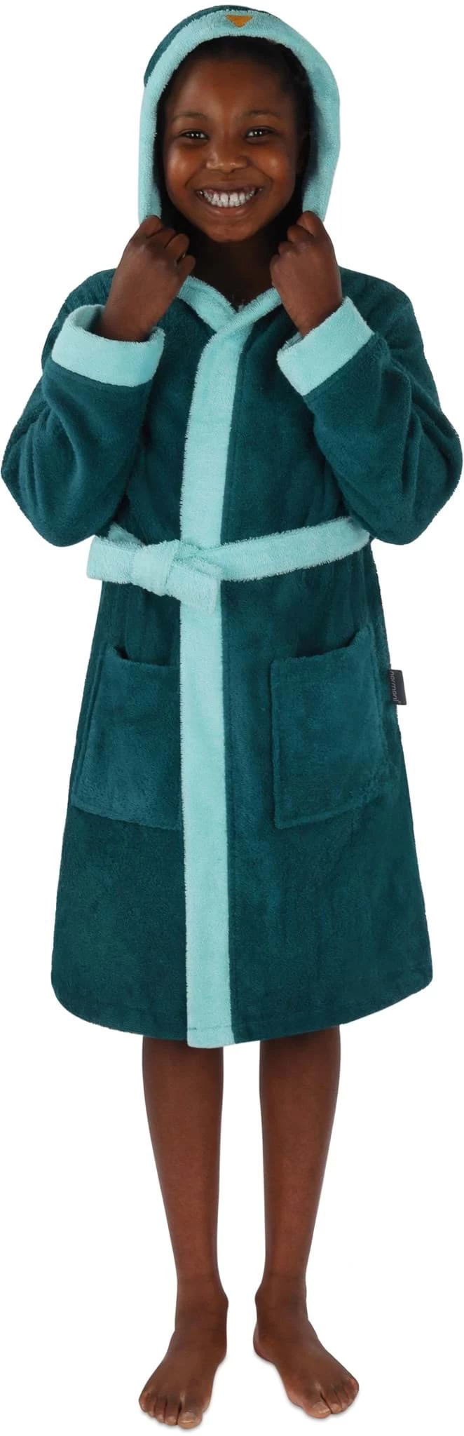 Durch die bestickte Kapuze mit Tiergesichtern bringt der Kinder Bademantel Spaß und Gemütlichkeit. Gleichzeitig sorgt das dichte Bio-Baumwollmaterial dafür, dass die Kleinen trocken und warm bleiben.