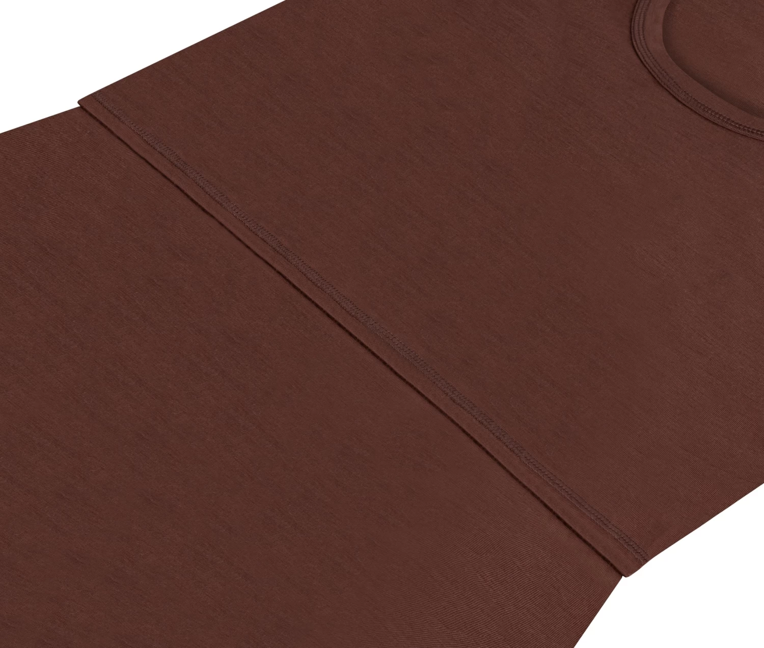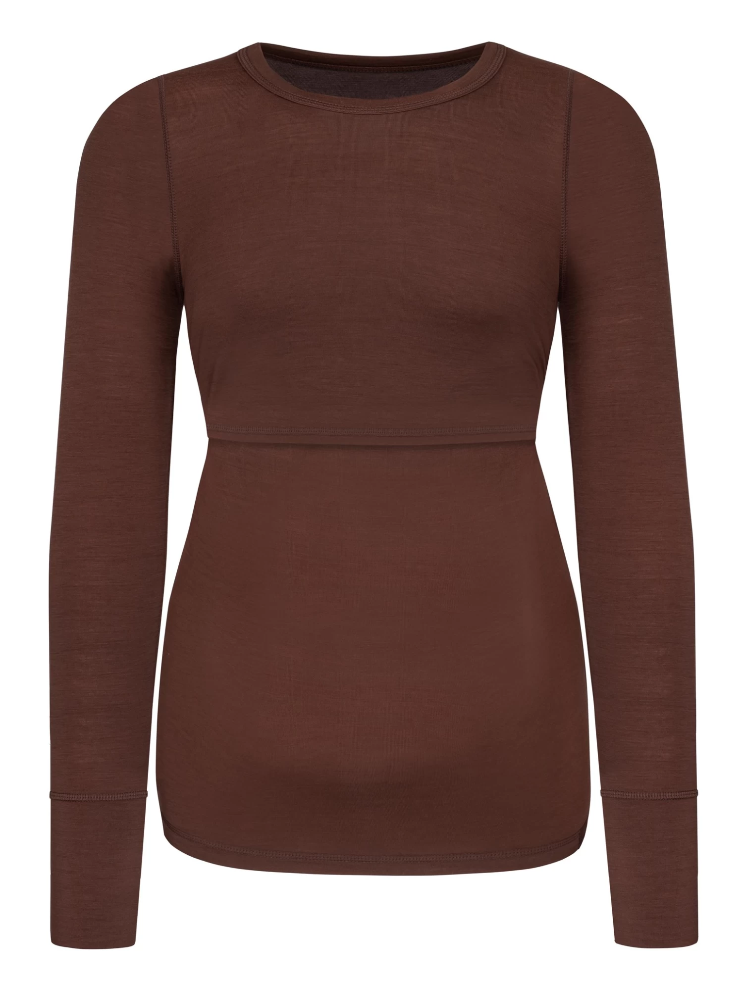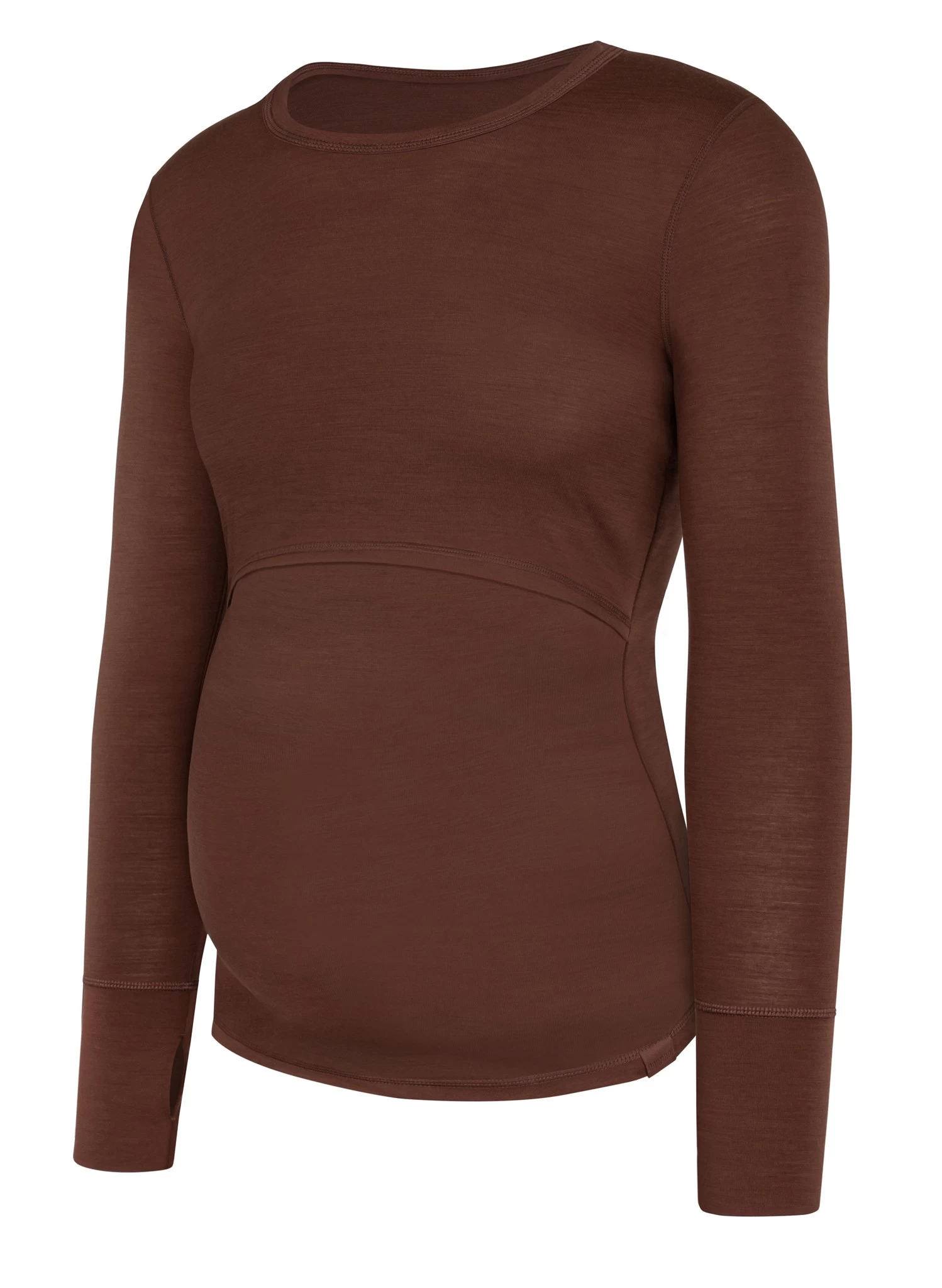 Mit unserem Merino Umstands-Langarm-Shirt „Cambria“ begleitet Dich die unschlagbare, von Mutter Natur höchst persönlich gelieferte Naturfaser Merinowolle durch die Schwangerschaft und darüber hinaus bis in die Stillzeit. Unser Merino Umstands-Langarm-Shirt besteht zu 94 % aus RWS zertifizierter Merinowolle und 6 % Elastan, sodass das Oberteil auch kurz vor der Geburt noch angenehm sitzt, ohne einzuschneiden. Das Shirt kann zur kälteren Jahreszeit im Alltag als bequemer Baselayer unter einem Pullover oder an warmen Tagen als Toplayer getragen werden. Merinowolle zeichnet sich besonders durch seine eigenständige Temperatur- und Feuchtigkeitsregulierung aus. Mit einer Grammatur von 200 g/m² wärmt das Oberteil aktiv bei Kälte, sogar im feuchten Zustand. Bei Hitze hingegen gibt das Oberteil gespeicherte Feuchtigkeit ab, wodurch es merklich kühlt. Außerdem leitet Merinowolle Feuchtigkeit vom Körper nach außen weg, wodurch Du beim leichten Sport während der Schwangerschaft deutlich trockener bleibst. Weiterhin ist an Merinowolle besonders auffällig, dass sie nicht auf der Haut kratzt. Selbst bei sehr sensiblen Hauttypen sorgt sie für bedeutend weniger bis gar keine Irritationen. Und zu guter Letzt ist Merinowolle nahezu geruchsneutral. Durch die spezielle Beschaffenheit der Faser werden unangenehme Gerüche deutlich langsamer aufgenommen, als bei vergleichbaren synthetischen Fasern. Sowohl der Elastananteil in Kombination mit dem dehnbaren Hüftbund, als auch der weite Rundhalsausschnitt sorgen für eine angenehme Bewegungsfreiheit. So lassen sich in unserem Merino Umstands-Langarm-Shirt auch problemlos leichte sportliche Übungen ausführen, sei es sanftes Joggen, Yoga oder der Geburtsvorbereitungskurs. Weiterhin sorgen die Daumenlöcher des Oberteils für angenehm warme Hände beim Sport oder generell an kühleren Tagen. Jedoch lässt sich das Merino Umstands-Langarm-Shirt auch nach der Schwangerschaft für die Stillzeit verwenden. Dank des doppellagigen Stoffs und des Eingriffs im Brustbereich lässt sich ihr Kind jederzeit schnell stillen. Das Design des Oberteils überzeugt mit seiner melierten Optik und seiner Schlichtheit, die das wesentliche auf den Punkt bringt.