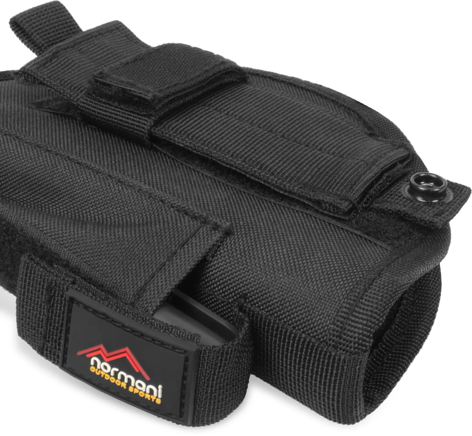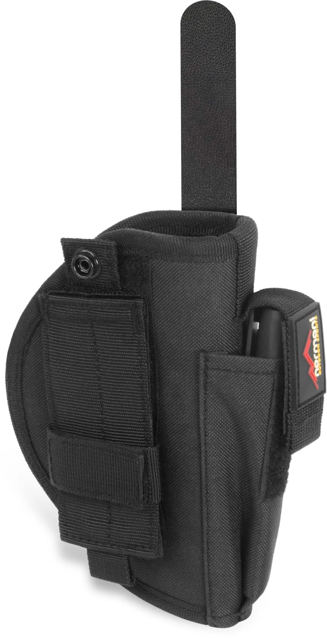 Das Pistolenholster „Hawk“ lässt sich dank des symmetrischen Aufbaus beidseitig befestigen und individuell einstellen, sodass es sowohl für Rechts- als auch für Linkshänder geeignet ist. Um ein Verrutschen der mitgeführten Waffe zu verhindern, wird der höhenverstellbare Sicherungsriemen per Klett und Druckknopf verschlossen. Dank angerauter Innenseite liegt die mitgeführte Kurzwaffe weich und sicher im Holster. Eine Befestigung an Gürtel oder Koppel ermöglicht ein schnelles Ziehen der Waffe. Die aufgesetzte Fronttasche ermöglicht das Mitführen eines Ersatzmagazins.