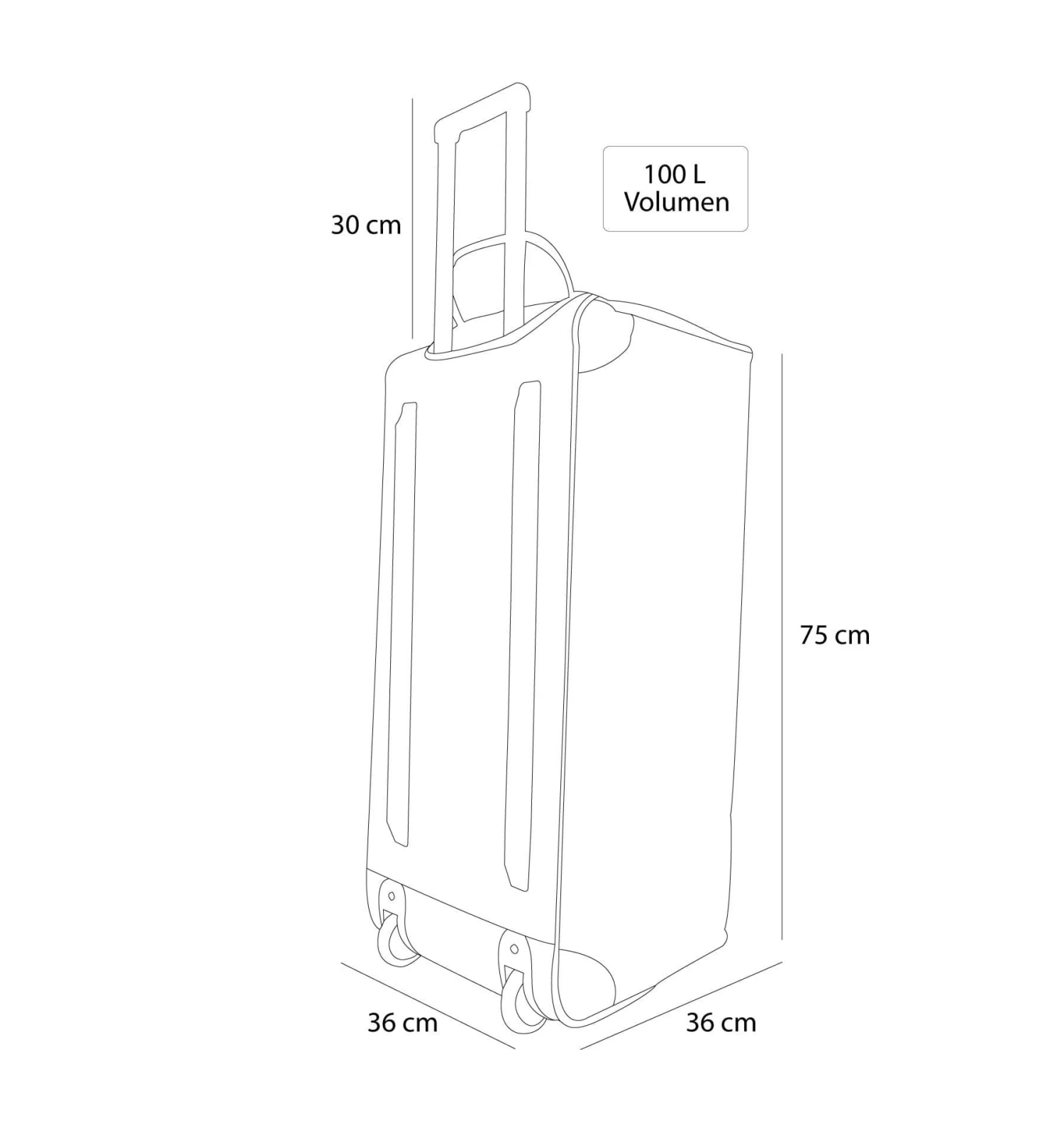 Diese Reisetasche verfügt dank geräumigem Hauptfach sowie diverser Nebenfächer über ein großes Gesamtvolumen von 100 Litern. Sie bietet damit mehr intelligent aufgeteilten Stauraum bei geringerem Eigengewicht als so mancher Koffer. Der versenkbare Trolleygriff ermöglicht, zusammen mit den 2 großen Laufrollen an der kurzen Seite, ein bequemes Mitführen. Dazu wird der Teleskopgriff ausgezogen und die Reisetasche leicht gekippt.