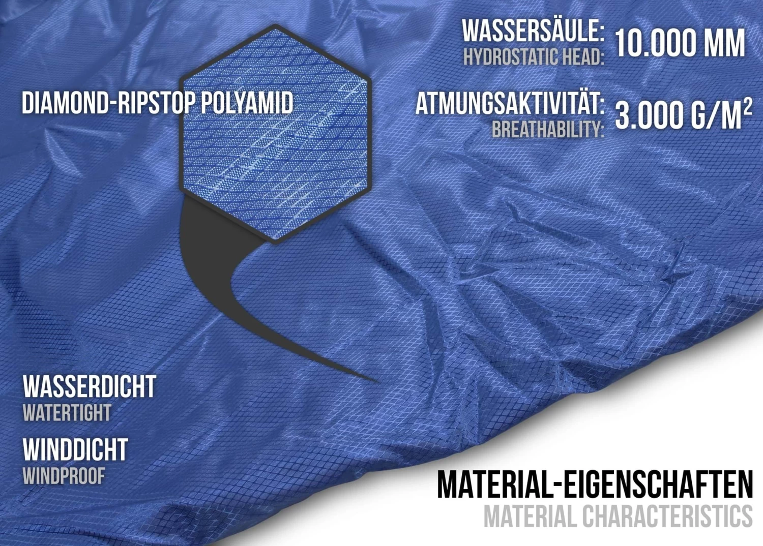 Das extrem reißfeste Diamond-Ripstop-Material mit einer Wassersäule von 10.000 mm sorgt dank per Hand verschweißten Nähten auch bei dauerhaft anhaltendem Regen für einen trockenen Innenraum. Besonders bei feuchtigkeitsempfindlichen Daunenschlafsäcken verklumpt die Füllung im nassen Zustand schnell und isoliert dadurch deutlich schlechter. Damit während Ihrer Nachtruhe kein Hitzestau oder Kondenswasser entsteht, ist der Oberstoff mit einer atmungsaktiven Membran ausgestattet, die die Feuchtigkeit nach außen lässt und übermäßiges Schwitzen verhindert. Die Atmungsaktivität beträgt 3.000 g/m²/24h. An zwei Schlaufen kann der Überzug zum Trocknen aufgehängt werden, durch einen in der Kapuze eingelassenen Kordelzug kann die Weite individuell an Ihren Hauptschlafsack angepasst werden. Der seitliche Markenreißverschluss von YKK ermöglicht ein leichtes Öffnen und Schließen der Schlafsackhülle. Der Reißverschluss ist mit einer Windschutzleiste bedeckt, welche mit Klettverschlüssen fixiert wird, sodass durch den Reißverschluss kein Wind oder Feuchtigkeit ins Innere gelangen können.