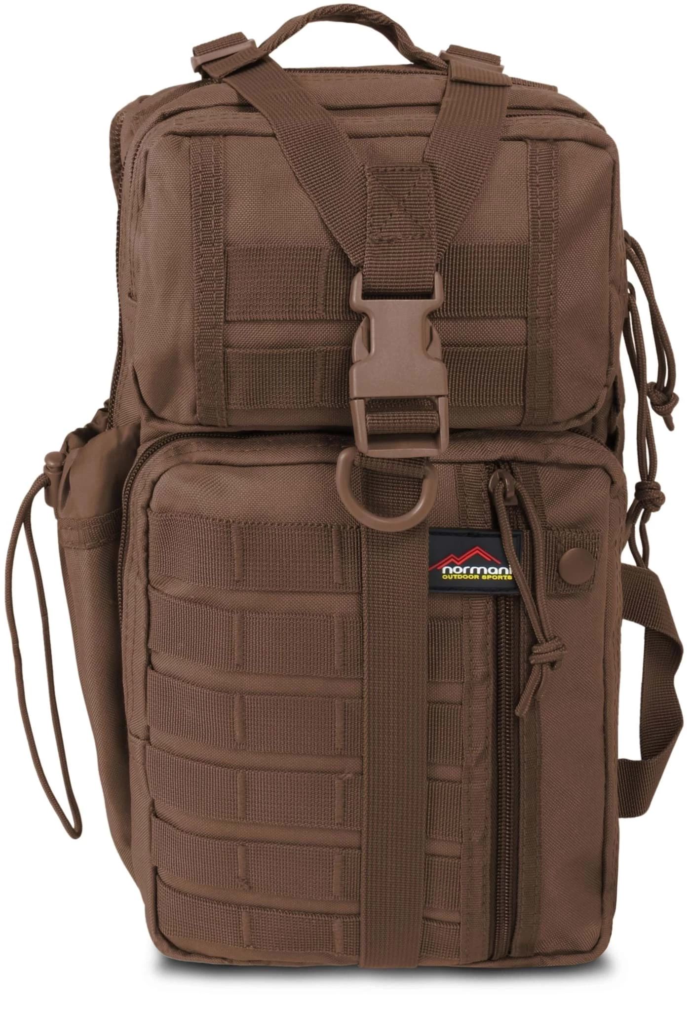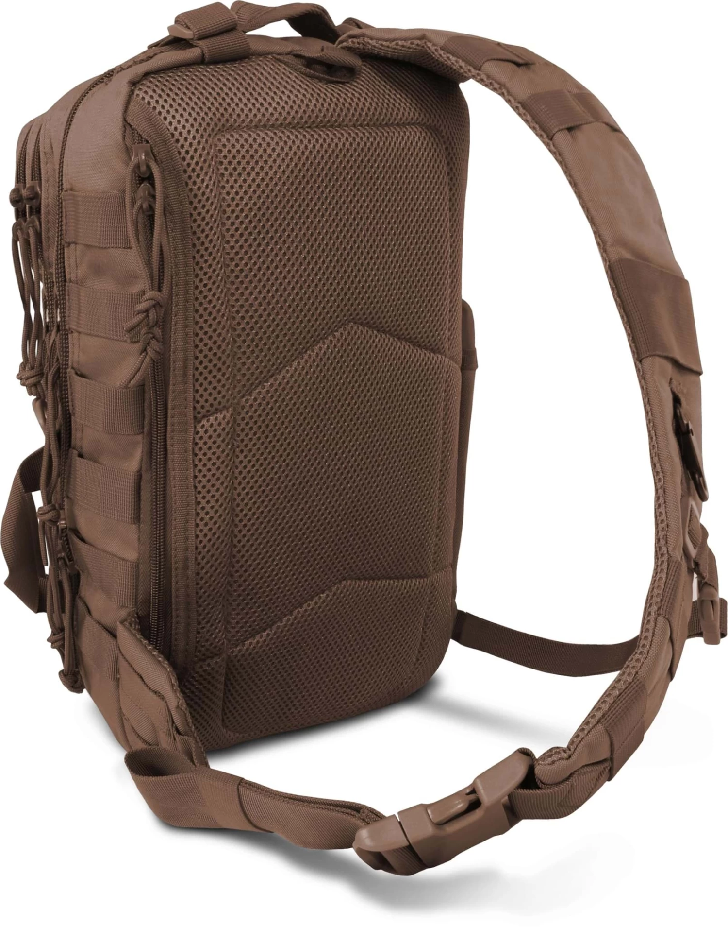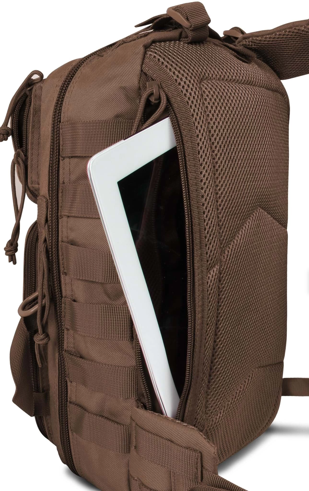 Praktische Schultertasche für Aktivitäten außerhalb der heimischen vier Wände. Unzählige Steck-und Einschubfächer lassen alle nötigen Reiseutensilien, wie Portemonnaie, Reisepass, Handy oder Schlüssel sortiert verstauen. Reiseführer, Trinkflasche und Stadtplaner finden im geräumigen Hauptfach ihren Platz. Für einen Laptop mit 12 Zoll Display oder ein Ipad Pro mit 10,5 Zoll, eignet sich das integrierte Laptopfach bestens. Für die Tagestour, an heißen Sommertagen, kann ein Hydropack im vorgesehenden Fach aufbewahrt werden. Durch die Öffnung kann der Schlauch mühelos und knickfrei nach Außen geführt werden. Im Seitenfach mit Kordelzug, lassen sich unterschiedlich große Trinkflaschen außerhalb am Rucksack mitführen. Der Schultergurt ist weich und schulterschonend gepolstert und kann, durch einen zusätzlichen Brustgurt fest am Körper fixiert werden. So kann die Schultertasche bei einer aktiven Bergtour am Rücken nicht verrutschen. An den vielzähligen MOLLE-Schlaufen, seitlich und im Frontbereich, lassen sich diverse Ergänzungsstücke einfach einbringen. Das atmungsaktive MESH-Gewebe auf der Rückseite, ist mit Belüftungskanälen durchzogen für maximale Luftzirkulation zwischen Rucksack und Körper.