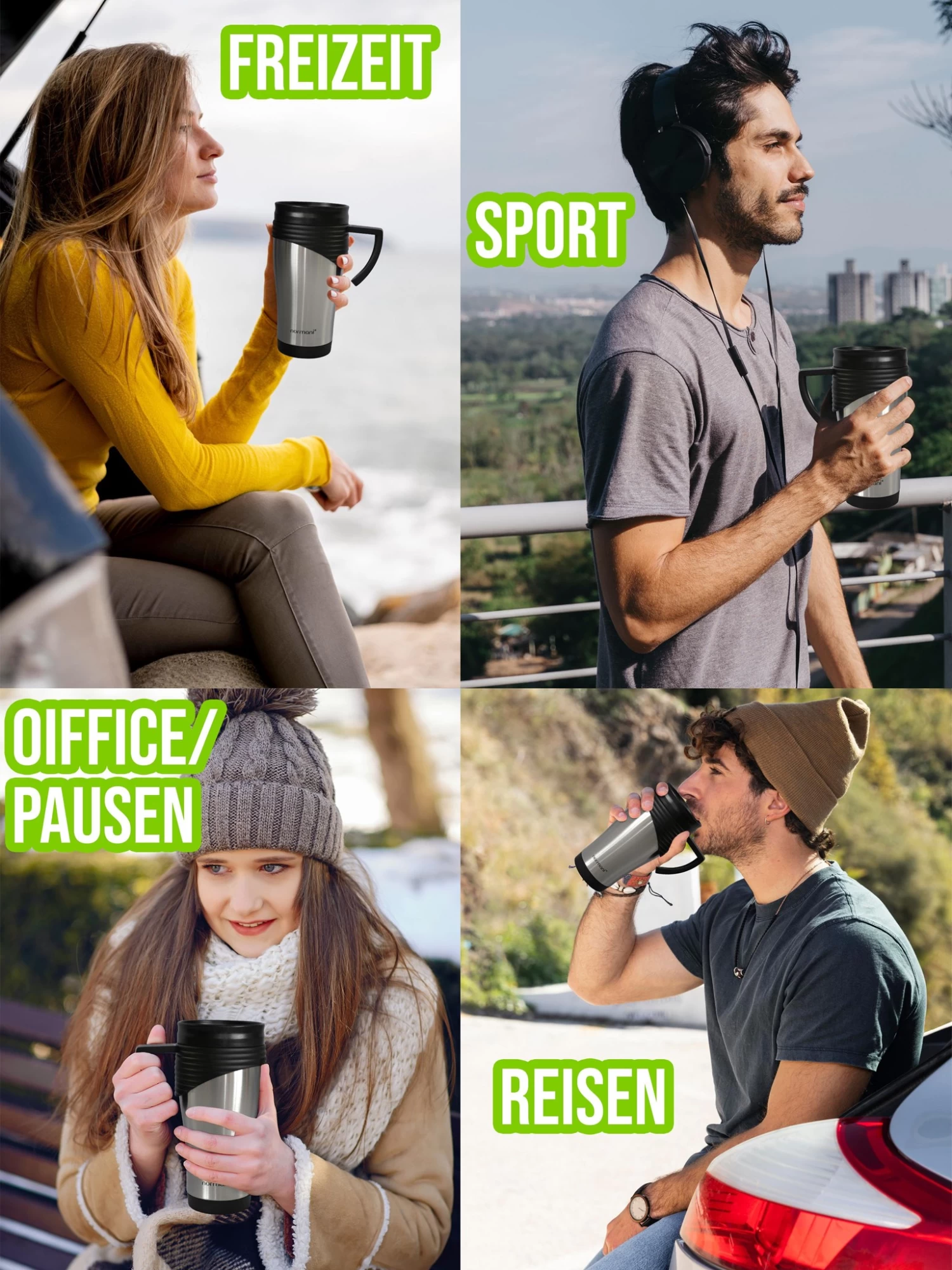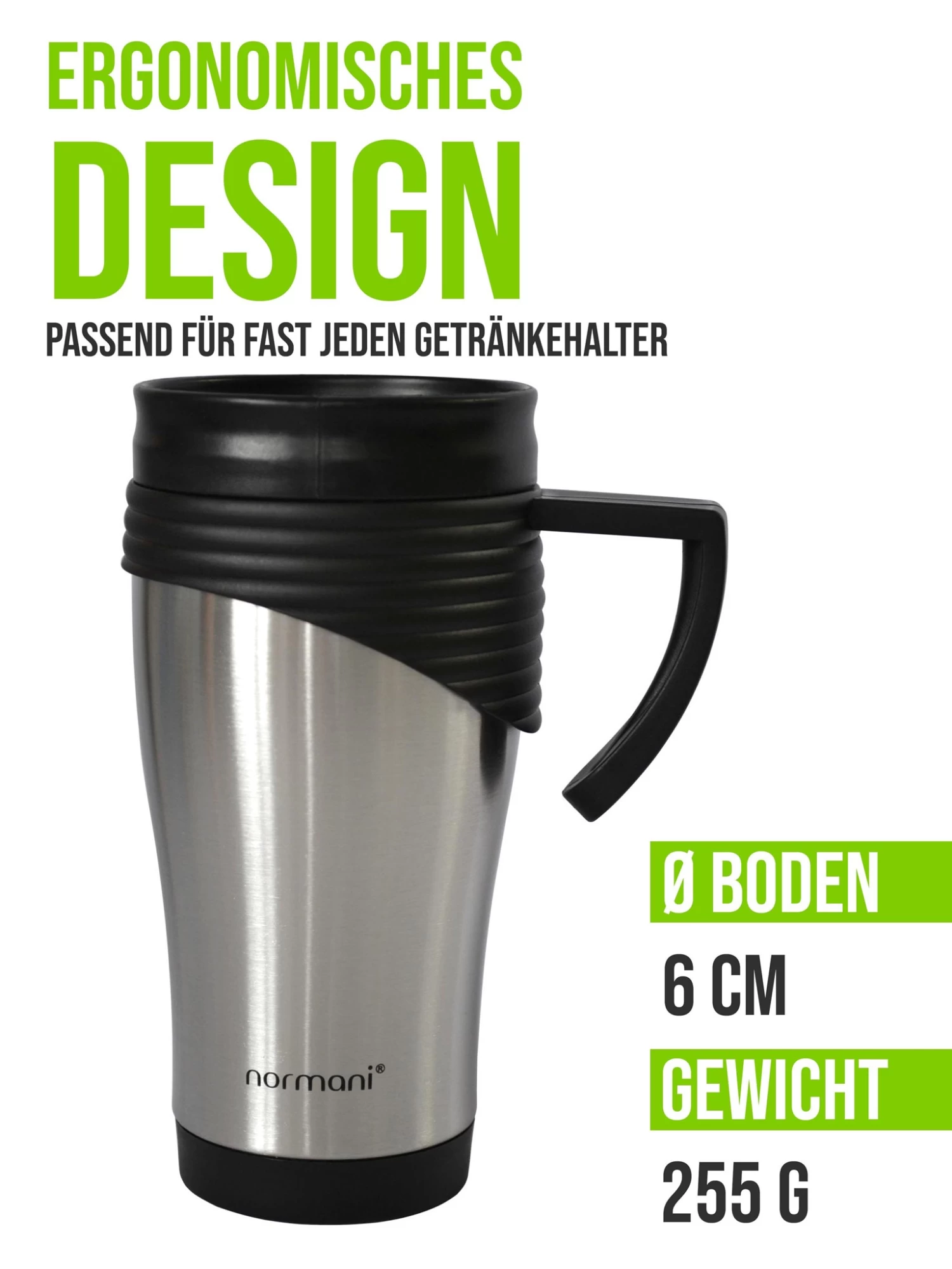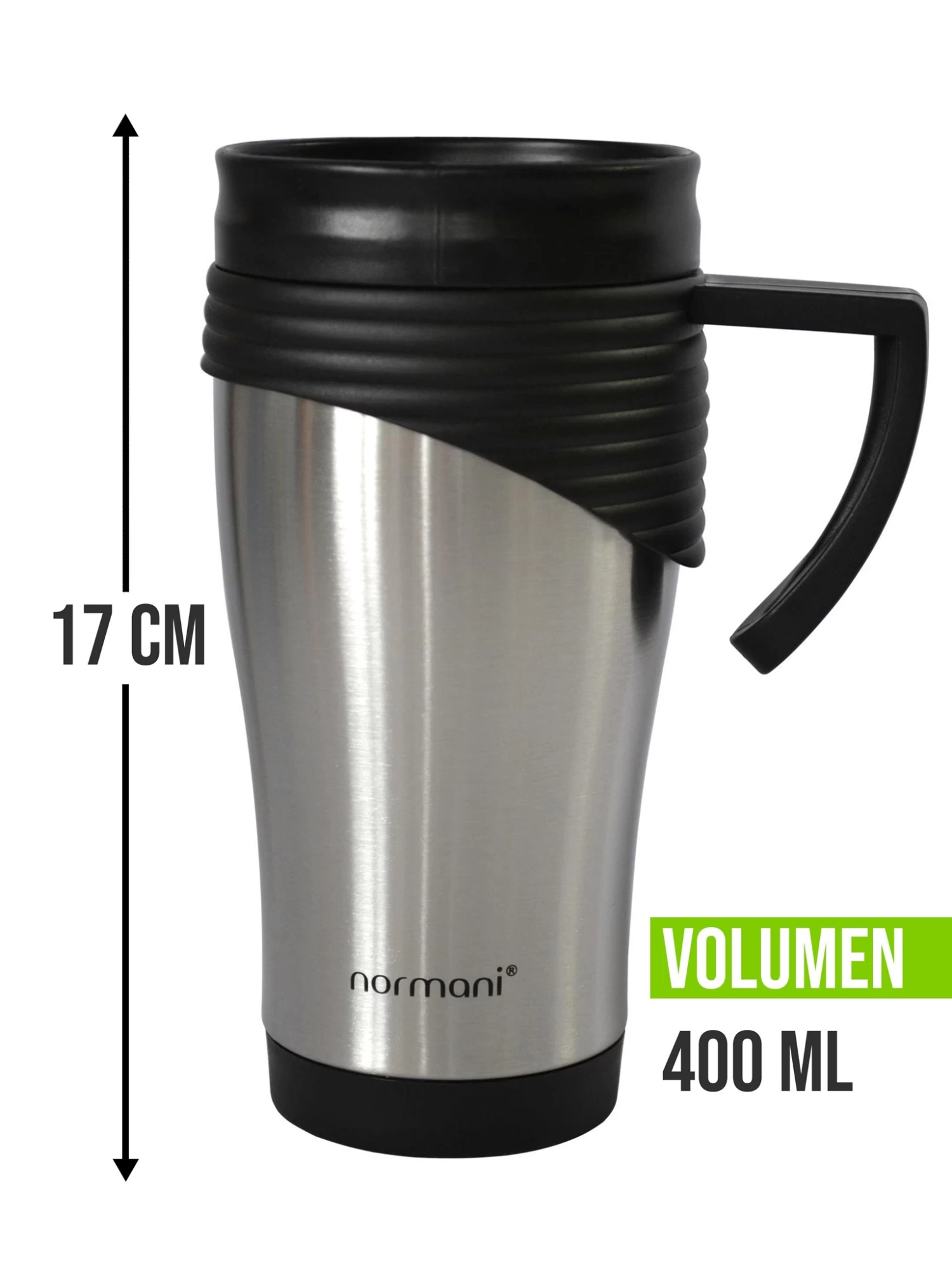 Der doppelwandige 400 ml Edelstahl/Kunststoff-Thermosbecher mit Deckel ist für alle gedacht, die morgens ihren heiß dampfenden Kaffee mit ins Auto nehmen wollen.