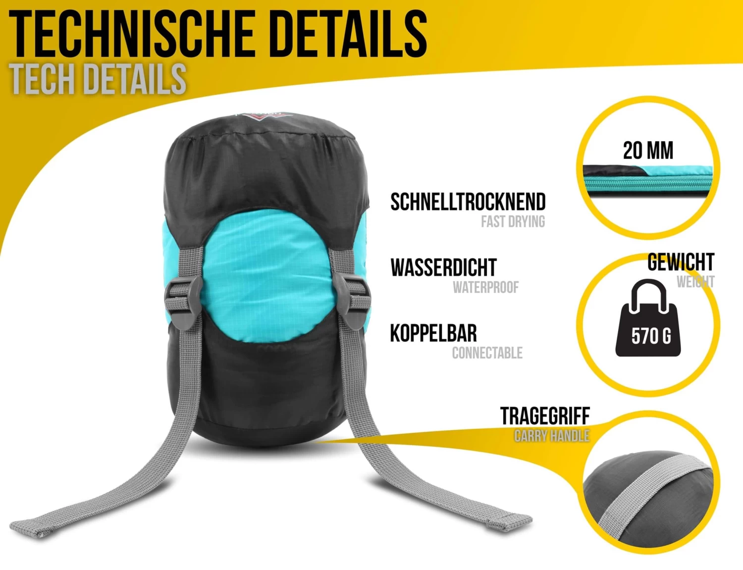 „Runty“ ist der kleinste und leichteste Schlafsack von normani OUTDOOR SPORTS. In zusammengeschnürtem Zustand wird ein Packmaß von gerade einmal 13 cm x 13 cm x 17 cm erreicht, wodurch er gewiss in jeden Rucksack passt und sich als wahres Stauraumwunder erweist. Ein Kompressionsbeutel mit vier Kompressionsriemen lässt den Schlafsack zum Transport stark zusammenschrumpfen. Vor allem für längere Wander- oder Radfahrtouren sowie anstrengende Bergetappen eignet sich der Schlafsack besonders gut, da sein Beisein dank Eigengewicht von einem halben Kilogramm kaum wahrgenommen wird. Trotz geringem Füllgewicht und dünner Materialstärke bietet der Schlafsack eine verhältnismäßig gute Isolation.