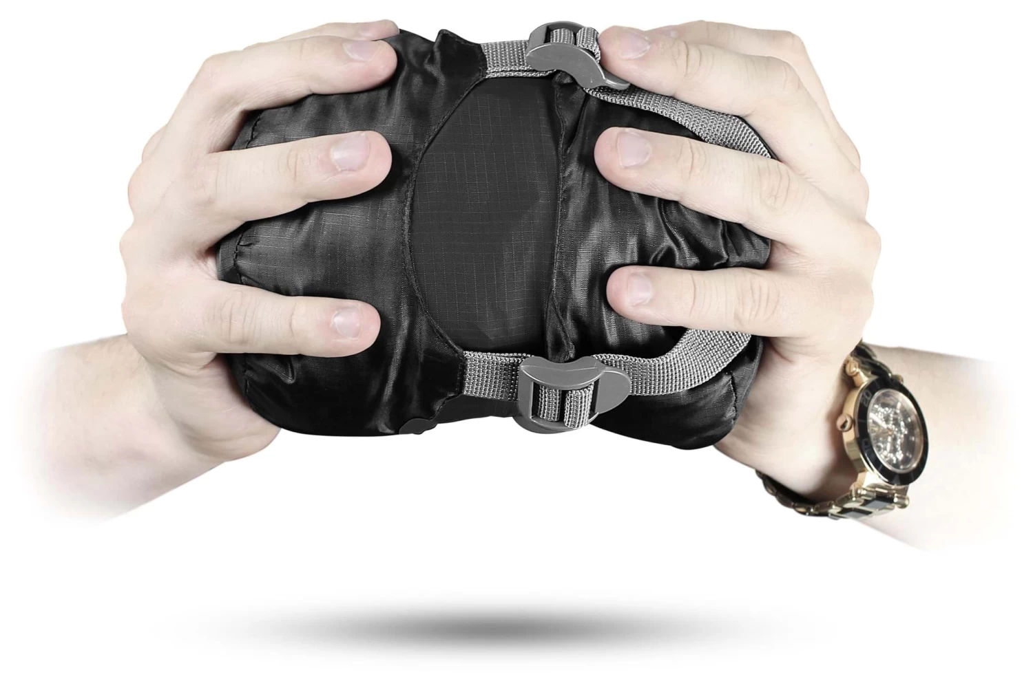 „Runty“ ist der kleinste und leichteste Schlafsack von normani OUTDOOR SPORTS. In zusammengeschnürtem Zustand wird ein Packmaß von gerade einmal 13 cm x 13 cm x 17 cm erreicht, wodurch er gewiss in jeden Rucksack passt und sich als wahres Stauraumwunder erweist. Ein Kompressionsbeutel mit vier Kompressionsriemen lässt den Schlafsack zum Transport stark zusammenschrumpfen. Vor allem für längere Wander- oder Radfahrtouren sowie anstrengende Bergetappen eignet sich der Schlafsack besonders gut, da sein Beisein dank Eigengewicht von einem halben Kilogramm kaum wahrgenommen wird. Trotz geringem Füllgewicht und dünner Materialstärke bietet der Schlafsack eine verhältnismäßig gute Isolation.