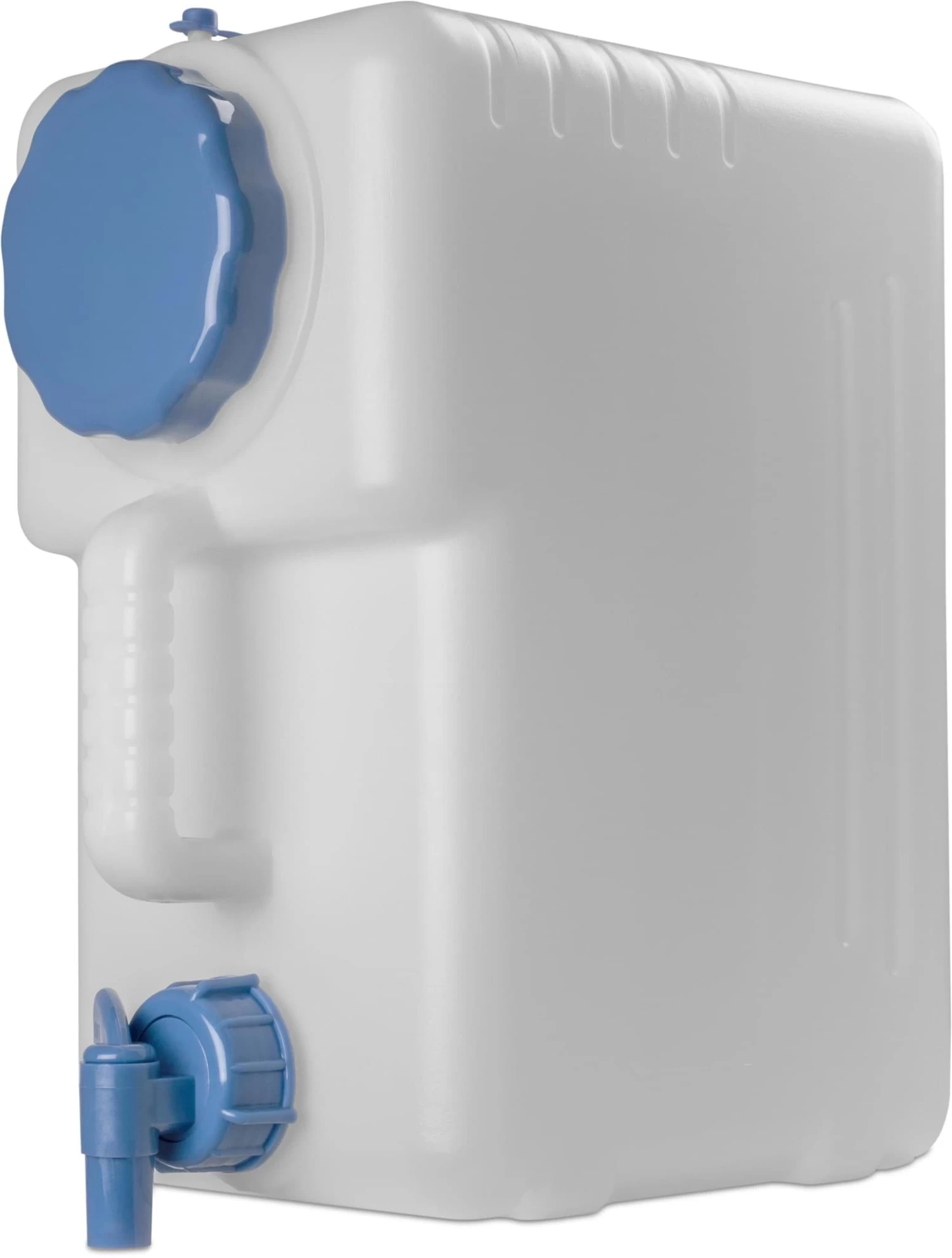 Der stabile und bruchsichere 15 Liter Mehrzweckkanister „Dispenser“ mit Hahn, Tragegriff und beidseitiger, aufschraubbarer Einfüllöffnung ist der ideale Begleiter im Wohnwagen, Caravan, Wohnmobil, Bully, Festival, Grillparty, Angeln oder Picknick im Stadtpark. Dank großer Einfüllöffnung, lässt sich der Wasserkanister sehr schnell befüllen, ebenso mühelos abfüllen und reinigen. Anhand des stabilen Tragegriffes lässt sich der Wasserkanister bequem zum Zelt oder Camping-Wagen transportieren. Auch das Abfüllen an entfernten Wasservorräten ist leicht zu Handhaben. Der Frischwasserkanister aus HD-PE besitzt eine chemische Beständigkeit gegen Fette, Harze, Laugen, Öle oder Säuren. Die Temperaturbeständigkeit liegt zwischen -30°C bis 110°C. Somit ist die Wasseraufbewahrung auch kühlschrankgeeignet. Als Alternative lässt sich der Wassertank auch als Abklärkanister benutzen. Die beiden Deckel schließen luft- und geruchsdicht. Die ungefärbte, naturfarbene thermoplastische Polyethylen-Oberfläche ist lebensmittelecht, geschmacks- und geruchsneutral. Daher wird dieser UV-beständige, bruchfeste Kunststoff für die OUTDOOR-Trinkwasserversorgung bevorzugt verwendet. HD-PE weist die höchste Zug- und Reißfestigekeit unter den Polyethylen auf. Der Hahn kann beliebig um 360° Grad gedreht werden. Das kleine, abgedeckte Ausgussstück sorgt für den nötigen Lufteinlass beim Schütten. Senkrecht aufgestellt, mit dem Hahn nach unten, entsteht genügend Wasserdruck um schnell Wasser entnehmen zu können. Mit dem Verschlussventil kann der Wasserfluss nach Wunsch reguliert werden. Umlaufende Griffrillen sorgen für einen verbesserten, rutschsicheren Halt. Standsicher ist der Kanister in 5 verschiedenen Positionen. Der geleerte Kanister sollte mit der aufgeschraubten Öffnung nach unten trocknen und vor der nächsten Benutzung mit sauberem Wasser durchgespült werden.